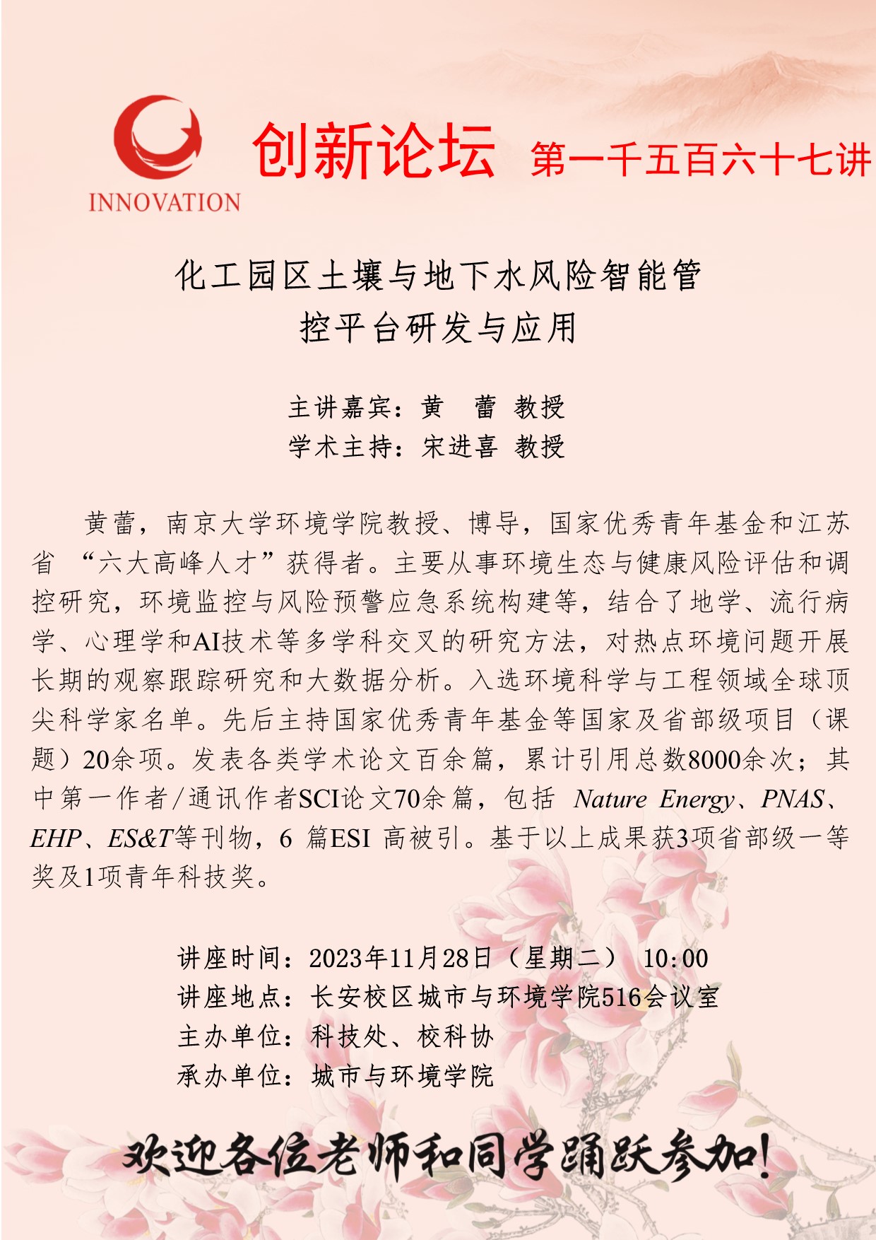黄蕾 教授 伟德国际1949始于英国创新论坛第一千五百六十七讲:化工园区土壤与地下水风险智能管控平台研发与应用 讲座时间 2023年11月28日(星期二) 10:00 讲座地点 长安校区城市与环境学院516会议室 讲座人介绍 黄蕾 教授 讲座内容