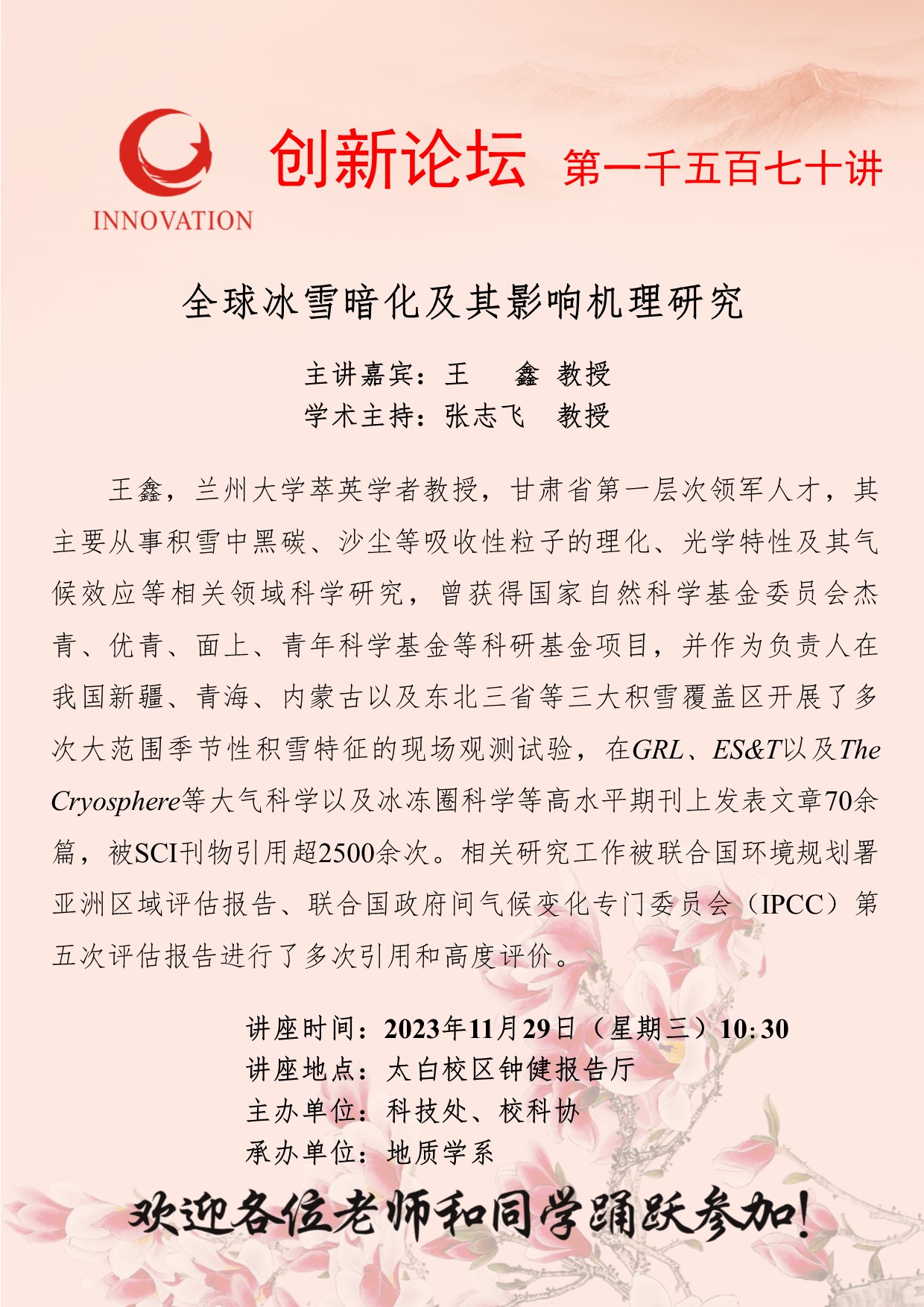 王鑫 教授 伟德国际1949始于英国创新论坛第一千五百七十讲:全球冰雪暗化及其影响机理研究 讲座时间 2023年11月29日(星期三)10:30 讲座地点 太白校区钟健报告厅 讲座人介绍 王鑫 教授 讲座内容