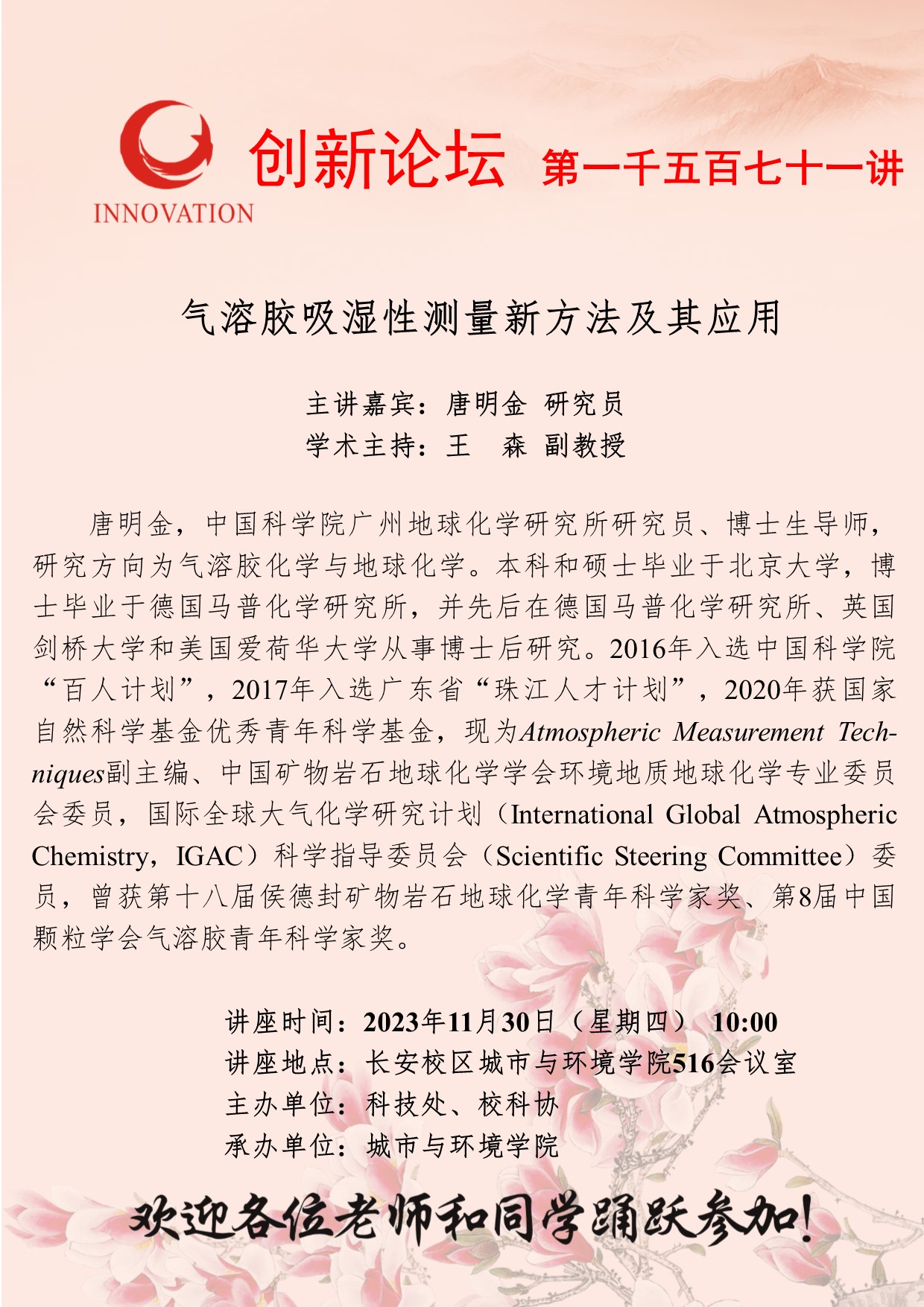 唐明金 研究员 伟德国际1949始于英国创新论坛第一千五百七十一讲:气溶胶吸湿性测量新方法及其应用 讲座时间 2023年11月30日(星期四) 10:00 讲座地点 长安校区城市与环境学院516会议室 讲座人介绍 唐明金 研究员 讲座内容