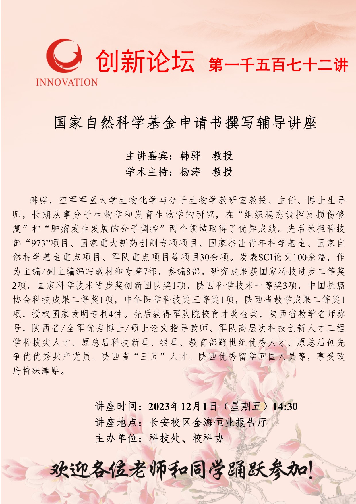 韩骅 教授 伟德国际1949始于英国创新论坛第一千五百七十二讲:国家自然科学基金申请书撰写辅导讲座 讲座时间 2023年12月1日(星期五)14:30 讲座地点 长安校区金海恒业报告厅 讲座人介绍 韩骅 教授 讲座内容