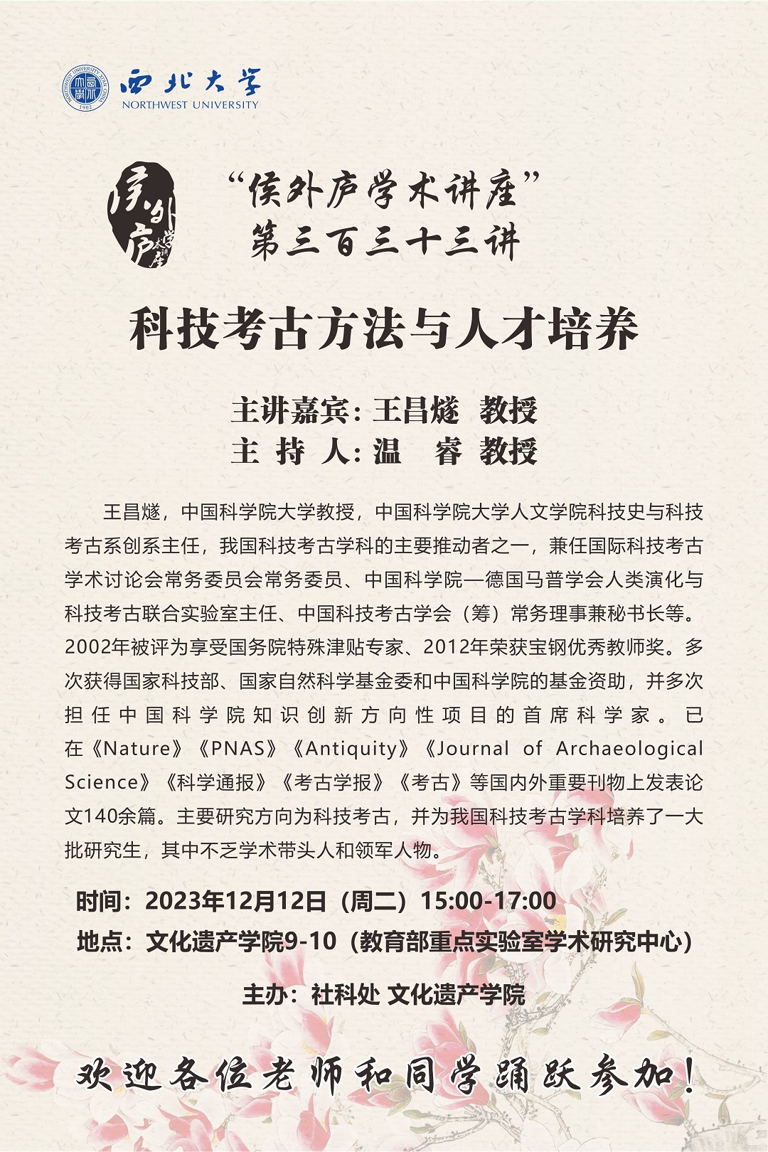 王昌燧 教授 侯外庐学术讲座第三百三十三讲:科技考古方法与人才培养 讲座时间 2023年12月12日(周二)15:00 讲座地点 文化遗产学院9-10(教育部重点实验室学术研究中心) 讲座人介绍 王昌燧 教授 讲座内容
