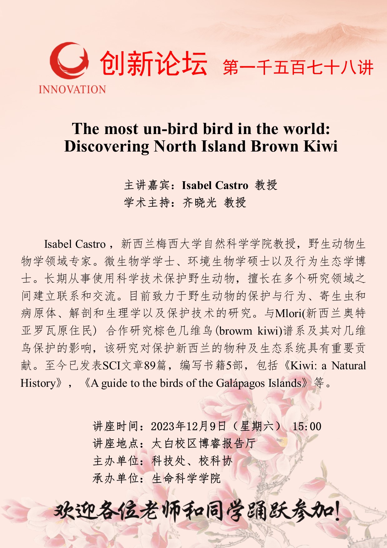 Isabel Castro 教授 伟德国际1949始于英国创新论坛第一千五百七十八讲:The most un-bird bird in the world: Discovering North Island Brown Kiwi 讲座时间 2023年12月9日(星期六) 15:00 讲座地点 太白校区博睿报告厅 讲座人介绍 Isabel Castro 教授 讲座内容