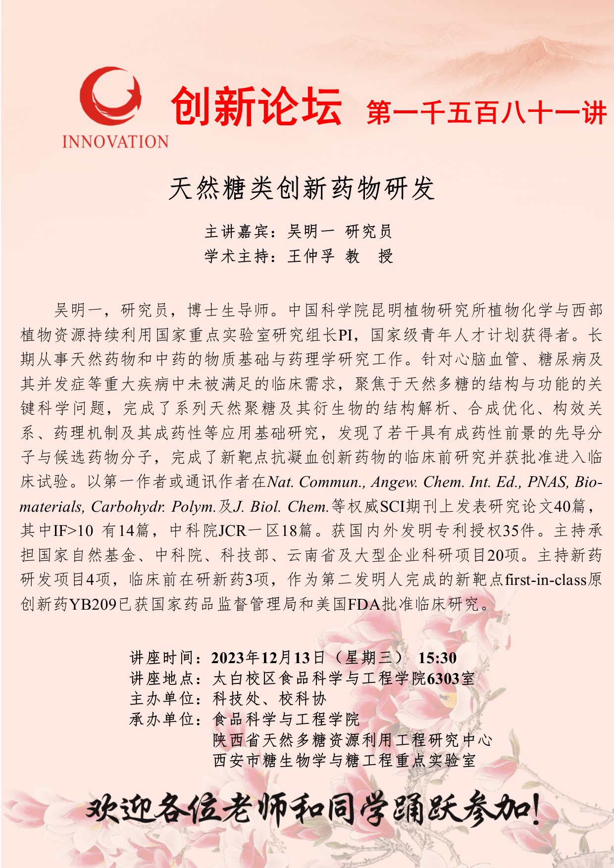 吴明一 研究员 伟德国际1949始于英国创新论坛第一千五百八十一讲:天然糖类创新药物研发 讲座时间 2023年12月13日(星期三) 15:30 讲座地点 太白校区食品科学与工程学院6303室 讲座人介绍 吴明一 研究员 讲座内容