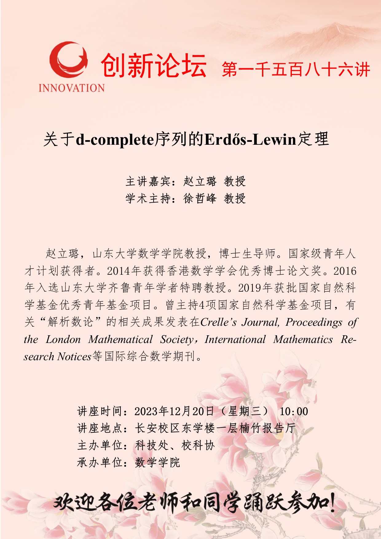 赵立璐 教授 伟德国际1949始于英国创新论坛第一千五百八十六讲:关于d-complete序列的Erdős-Lewin定理 讲座时间 2023年12月20日(星期三) 10:00 讲座地点 长安校区东学楼一层楠竹报告厅 讲座人介绍 赵立璐 教授 讲座内容