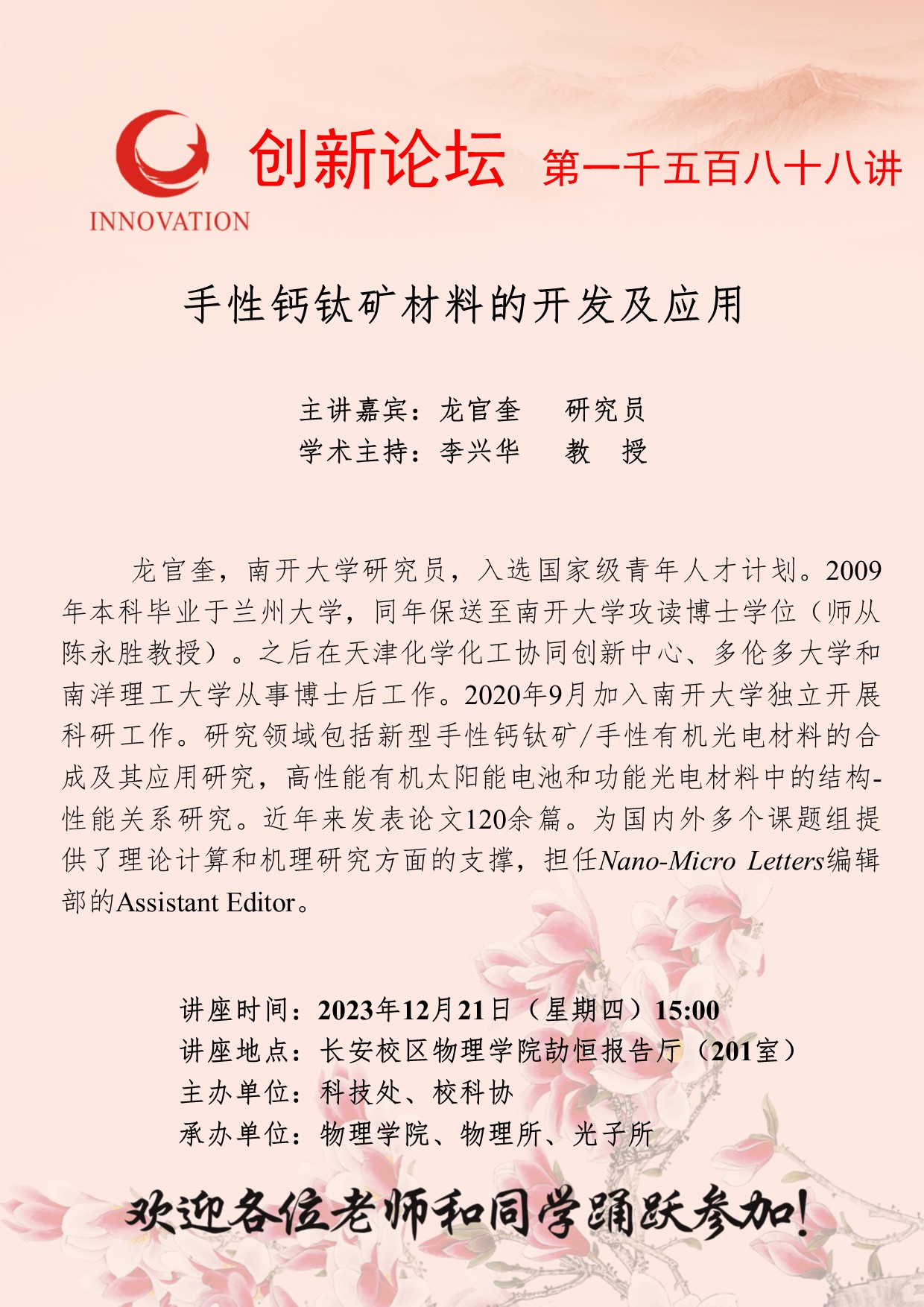 龙官奎 研究员 伟德国际1949始于英国创新论坛第一千五百八十八讲:手性钙钛矿材料的开发及应用 讲座时间 2023年12月21日(星期四)15:00 讲座地点 长安校区物理学院劼恒报告厅(201室) 讲座人介绍 龙官奎 研究员 讲座内容