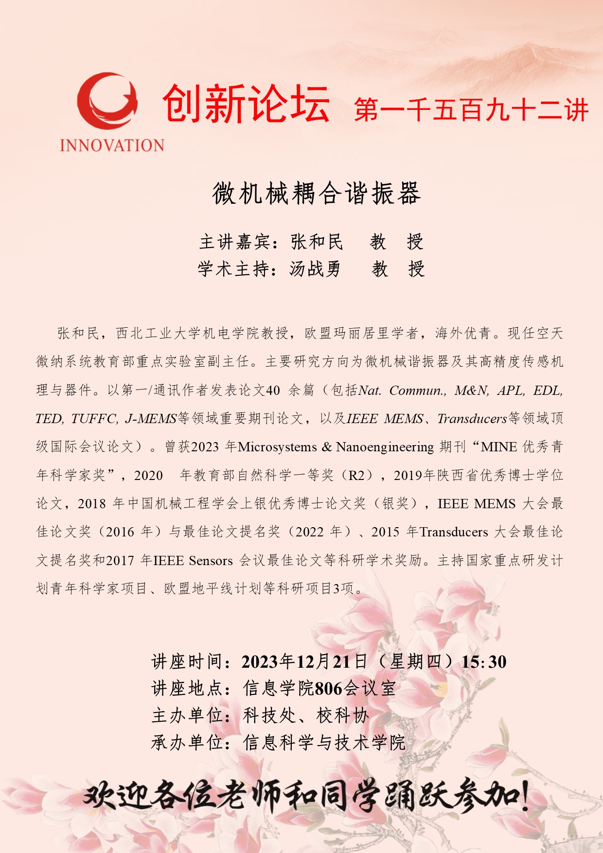 张和民 教授 伟德国际1949始于英国创新论坛第一千五百九十二讲:微机械耦合谐振器 讲座时间 2023年12月21日(星期四)15:30 讲座地点 信息学院806会议室 讲座人介绍 张和民 教授 讲座内容