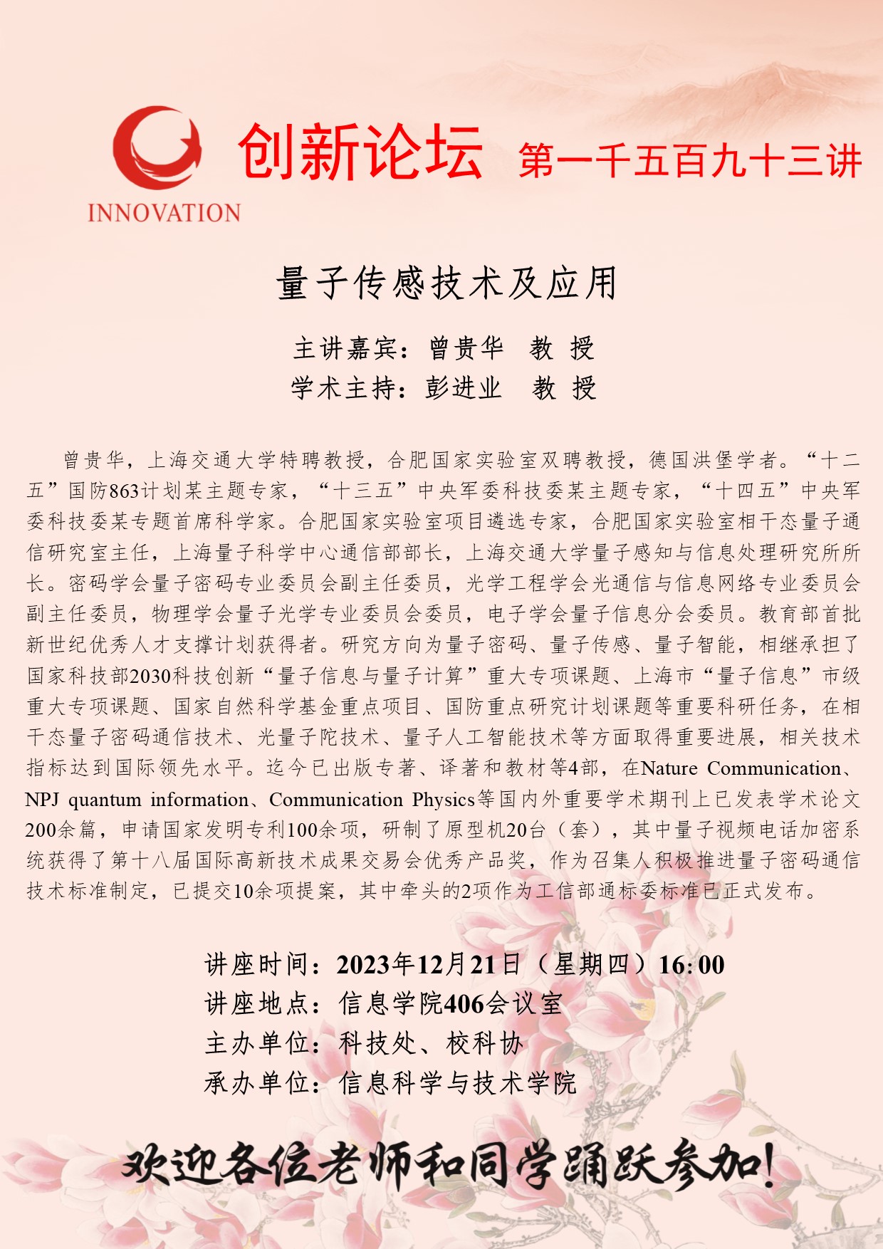 曾贵华 教授 伟德国际1949始于英国创新论坛第一千五百九十三讲:量子传感技术及应用 讲座时间 2023年12月21日(星期四)16:00 讲座地点 信息学院406会议室 讲座人介绍 曾贵华 教授 讲座内容