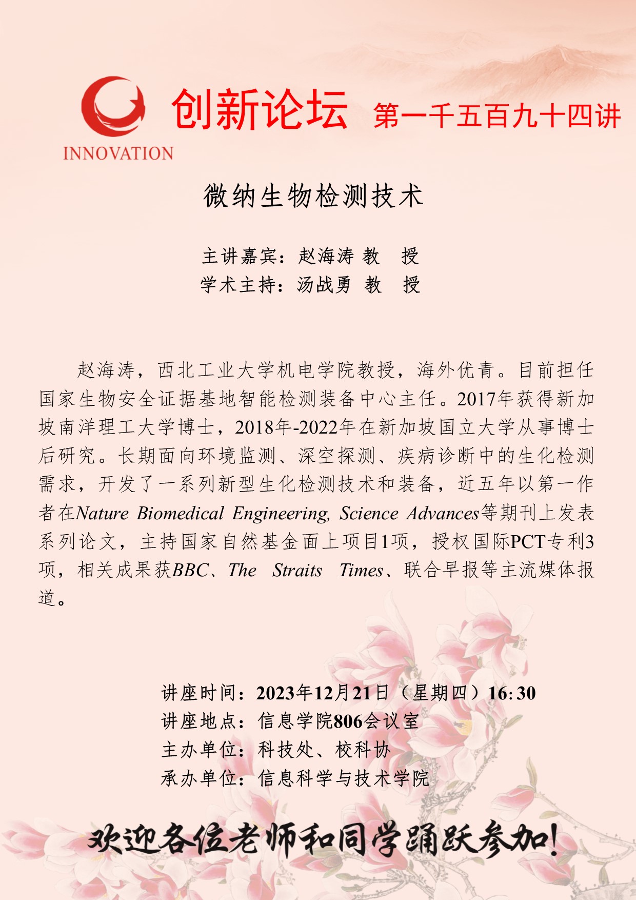 赵海涛 教授 伟德国际1949始于英国创新论坛第一千五百九十四讲:微纳生物检测技术 讲座时间 2023年12月21日(星期四)16:30 讲座地点 信息学院806会议室 讲座人介绍 赵海涛 教授 讲座内容