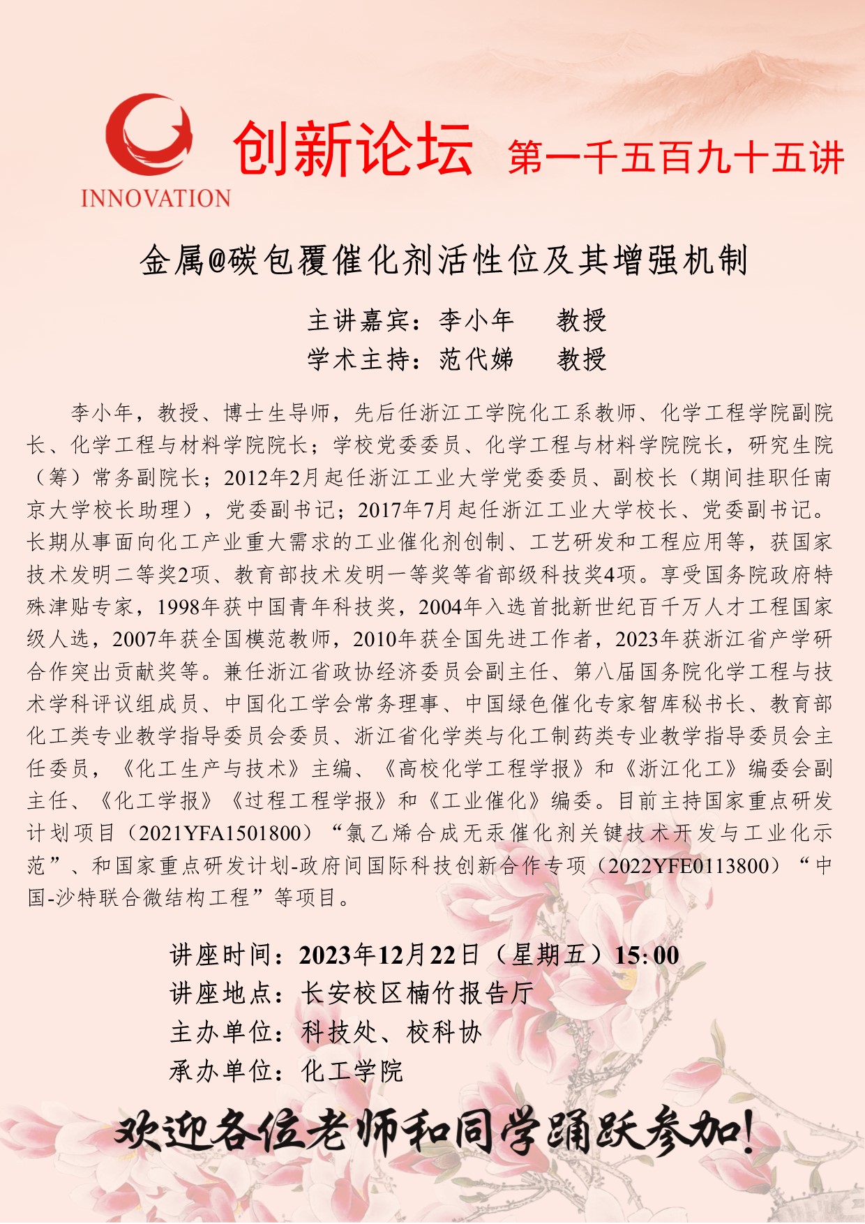 李小年 教授 伟德国际1949始于英国创新论坛第一千五百九十五讲:金属@碳包覆催化剂活性位及其增强机制 讲座时间 2023年12月22日(星期五)15:00 讲座地点 长安校区楠竹报告厅 讲座人介绍 李小年 教授 讲座内容