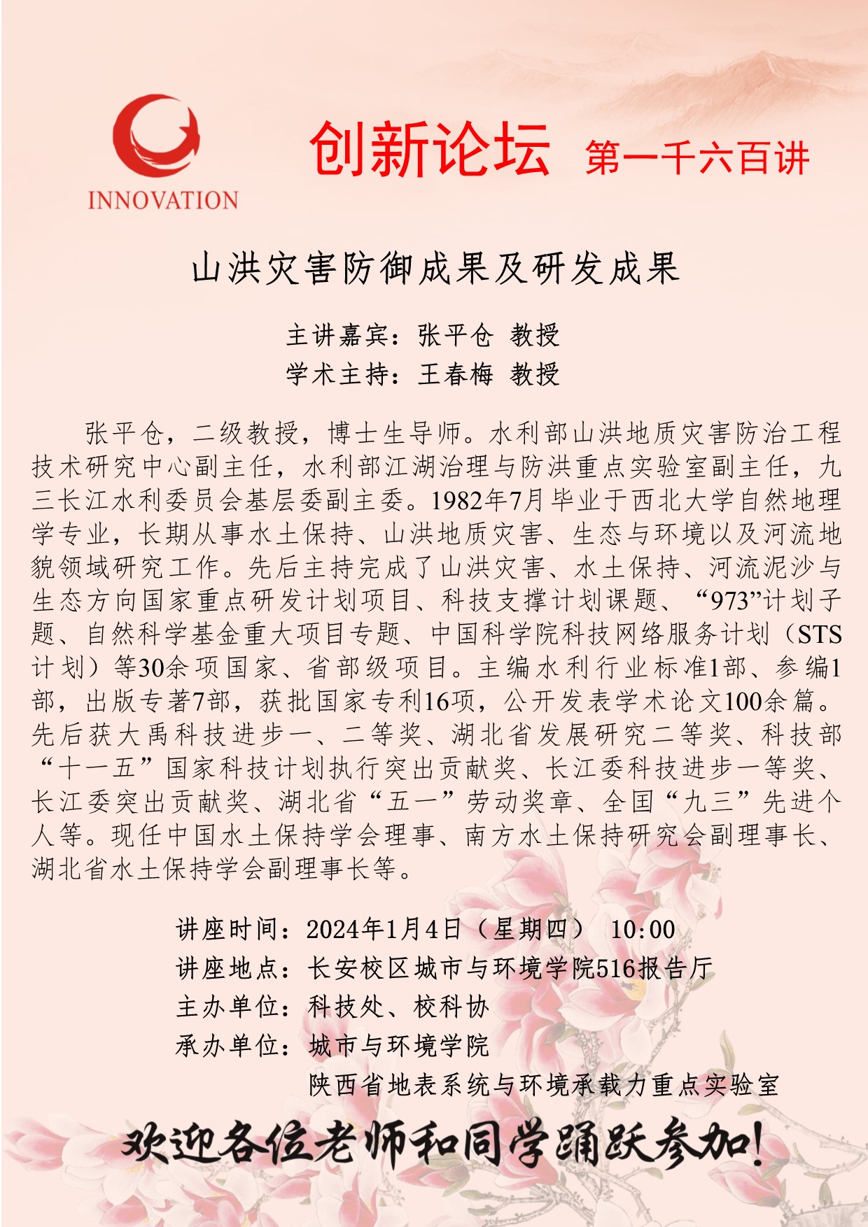 张平仓 教授 伟德国际1949始于英国创新论坛第一千六百讲:山洪灾害防御成果及研发成果 讲座时间 2024年1月4日(星期四) 10:00 讲座地点 长安校区城市与环境学院516报告厅 讲座人介绍 张平仓 教授 讲座内容