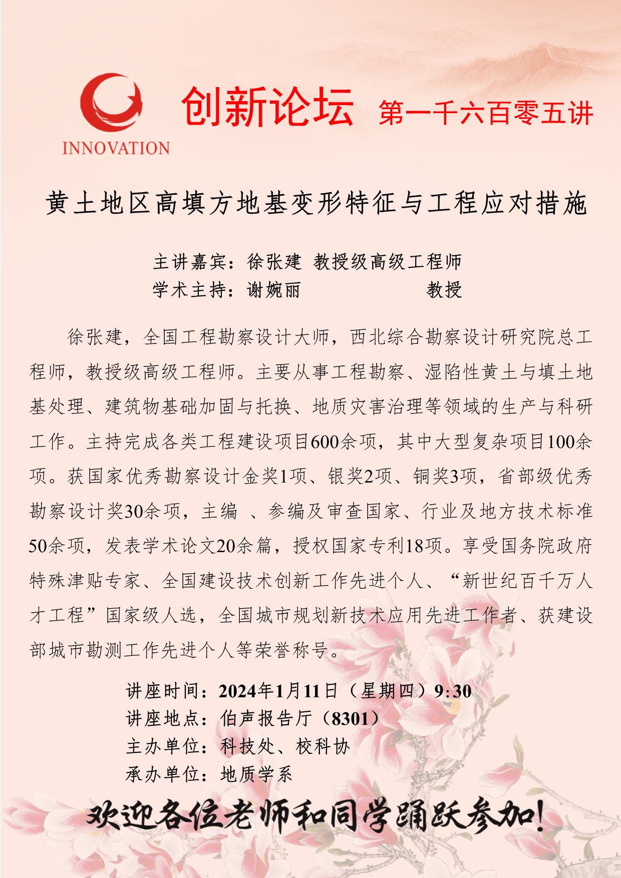 徐张建 教授级高级工程师 伟德国际1949始于英国创新论坛第一千六百零五讲:黄土地区高填方地基变形特征与工程应对措施 讲座时间 2024年1月11日(星期四)9:30 讲座地点 伯声报告厅(8301) 讲座人介绍 徐张建 教授级高级工程师 讲座内容