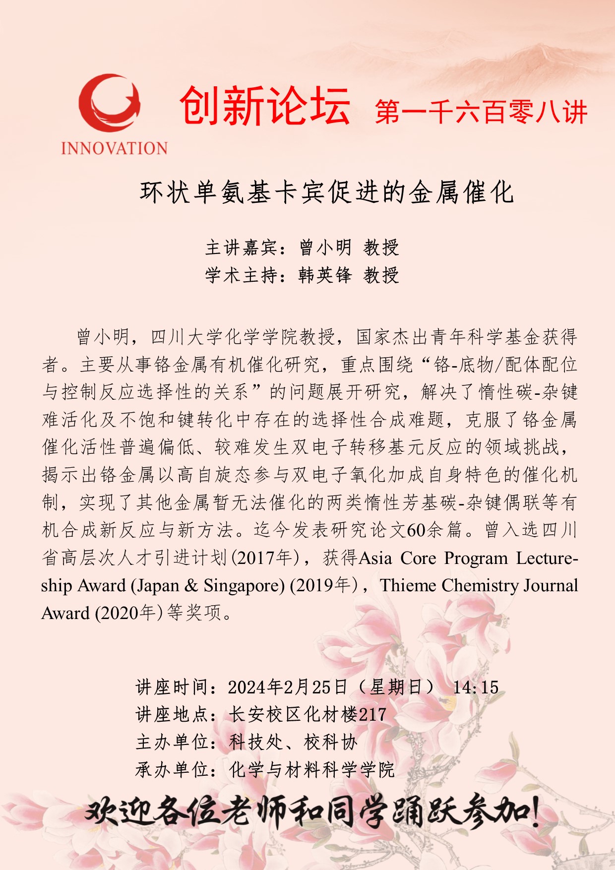 曾小明 教授 伟德国际1949始于英国创新论坛第一千六百零八讲: 环状单氨基卡宾促进的金属催化 讲座时间 2024年2月25日(星期日) 14:15 讲座地点 长安校区化材楼217 讲座人介绍 曾小明 教授 讲座内容
