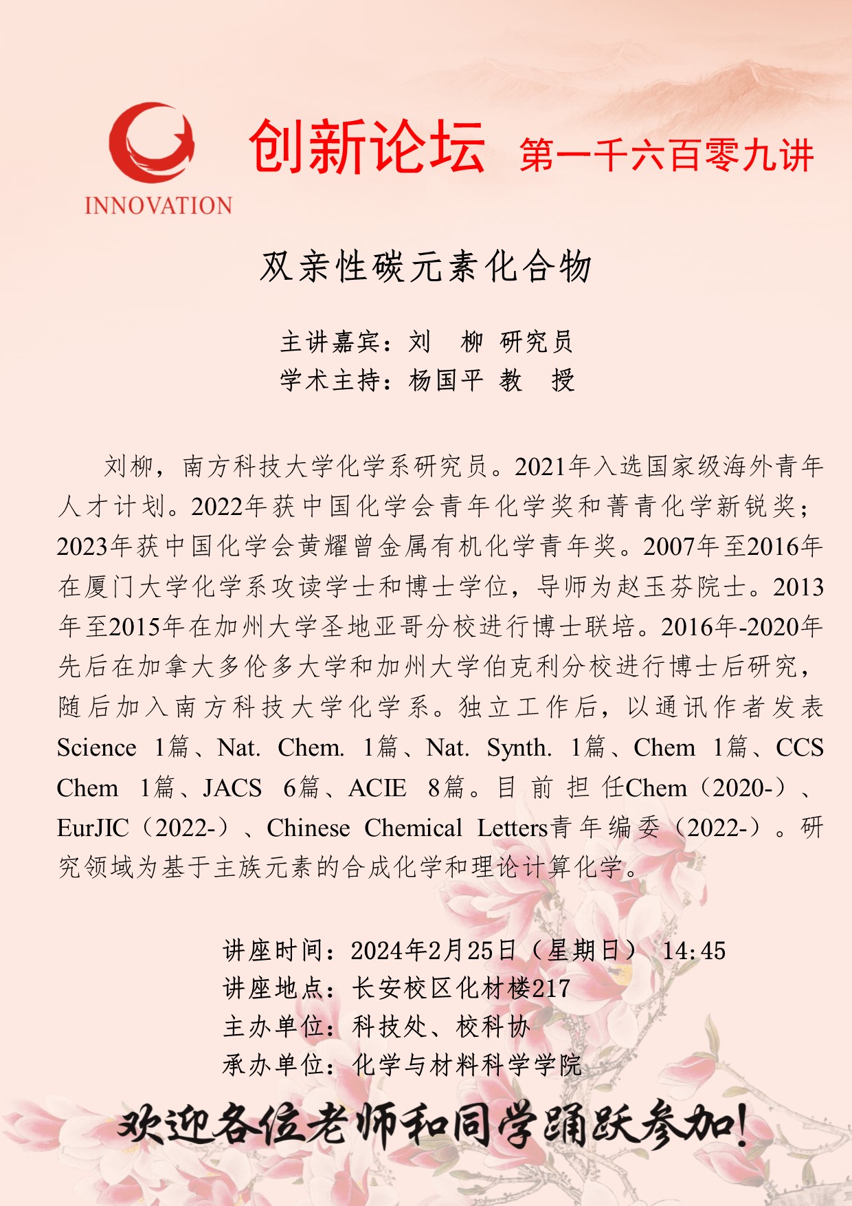 刘柳 研究员 伟德国际1949始于英国创新论坛第一千六百零九讲:双亲性碳元素化合物 讲座时间 2024年2月25日(星期日) 14:45 讲座地点 长安校区化材楼217 讲座人介绍 刘柳 研究员 讲座内容