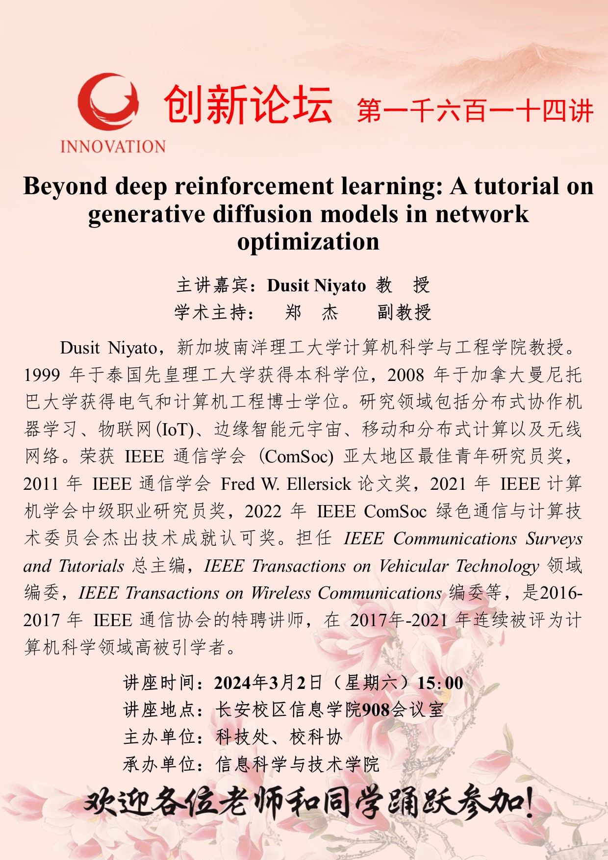Dusit Niyato 教授 伟德国际1949始于英国创新论坛第一千六百一十四讲:Beyond deep reinforcement learning: A tutorial on generative diffusion models in network optimization 讲座时间 2024年3月2日(星期六)15:00 讲座地点 长安校区信息学院908会议室 讲座人介绍 Dusit Niyato 教授 讲座内容