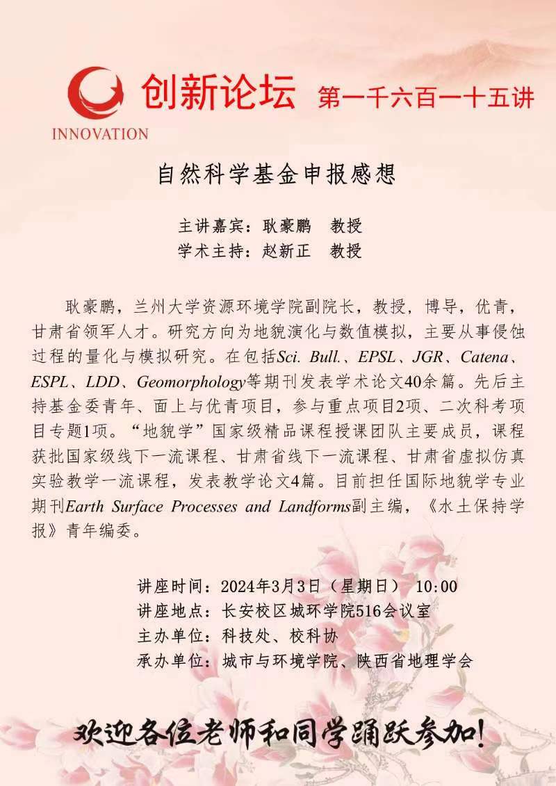 耿豪鹏 教授 伟德国际1949始于英国创新论坛第一千六百一十五讲:自然科学基金申报感想 讲座时间 2024年3月3日(星期日) 10:00 讲座地点 长安校区城环学院516会议室 讲座人介绍 耿豪鹏 教授 讲座内容