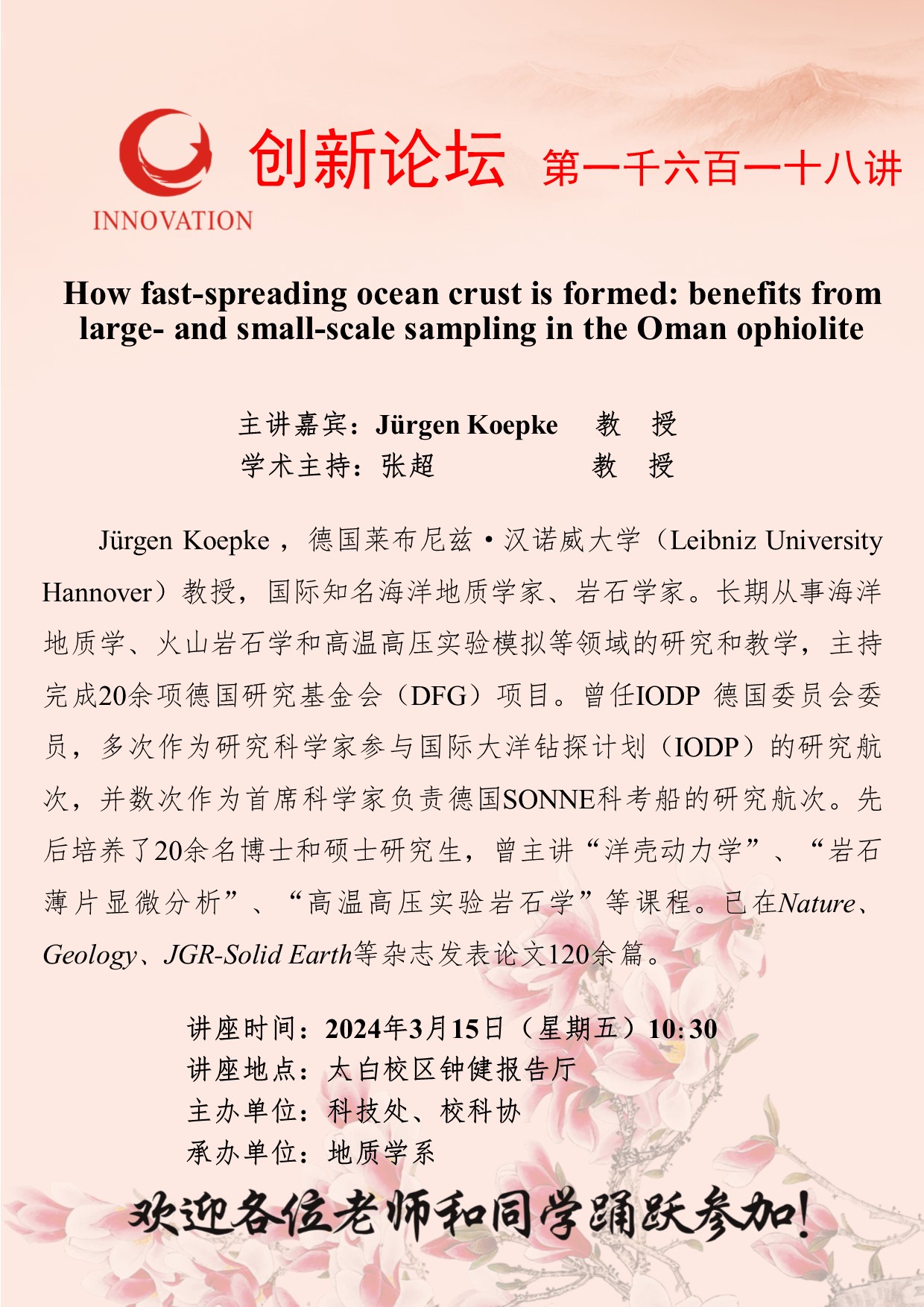 Jürgen Koepke 教 授 伟德国际1949始于英国创新论坛第一千六百一十八讲:How fast-spreading ocean crust is formed: benefits from large- and small-scale sampling in the Oman ophiolite 讲座时间 2024年3月15日(星期五)10:30 讲座地点 太白校区钟健报告厅 讲座人介绍 Jürgen Koepke 教 授 讲座内容