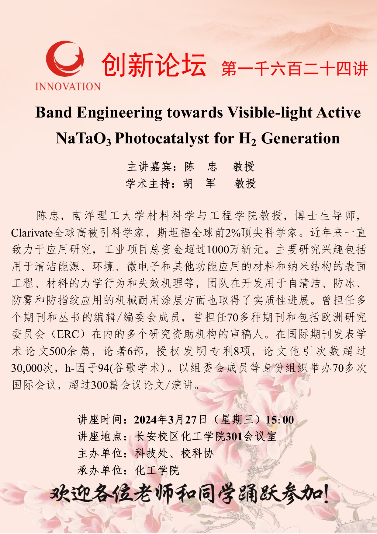 陈忠 教授 伟德国际1949始于英国创新论坛第一千六百二十四讲:Band Engineering towards Visible-light Active NaTaO3 Photocatalyst for H2 Generation 讲座时间 2024年3月27日(星期三)15:00 讲座地点 长安校区化工学院301会议室 讲座人介绍 陈忠 教授 讲座内容