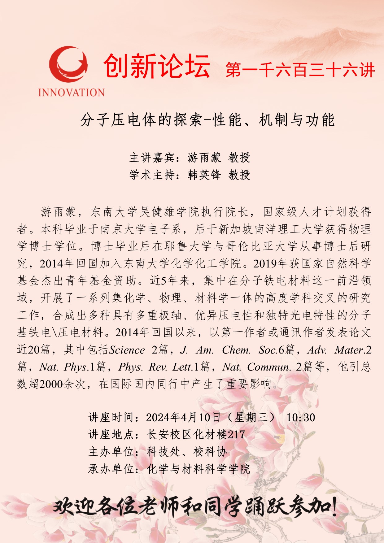 游雨蒙 教授 伟德国际1949始于英国创新论坛第一千六百三十六讲:分子压电体的探索-性能、机制与功能 讲座时间 2024年4月10日(星期三) 10:30 讲座地点 长安校区化材楼217 讲座人介绍 游雨蒙 教授 讲座内容