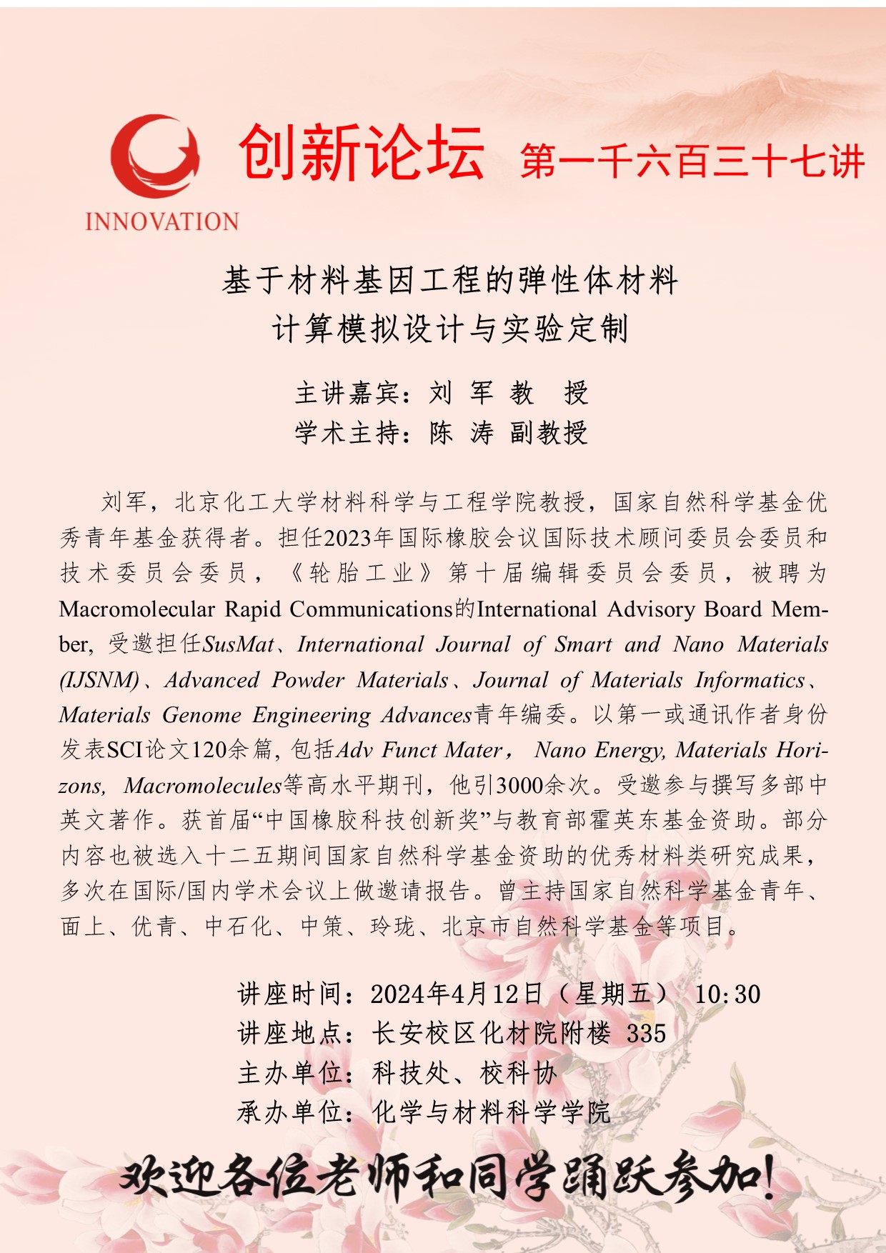 刘军 教授 伟德国际1949始于英国创新论坛第一千六百三十七讲:基于材料基因工程的弹性体材料计算模拟设计与实验定制 讲座时间 2024年4月12日(星期五) 10:30 讲座地点 长安校区化材院附楼335 讲座人介绍 刘军 教授 讲座内容