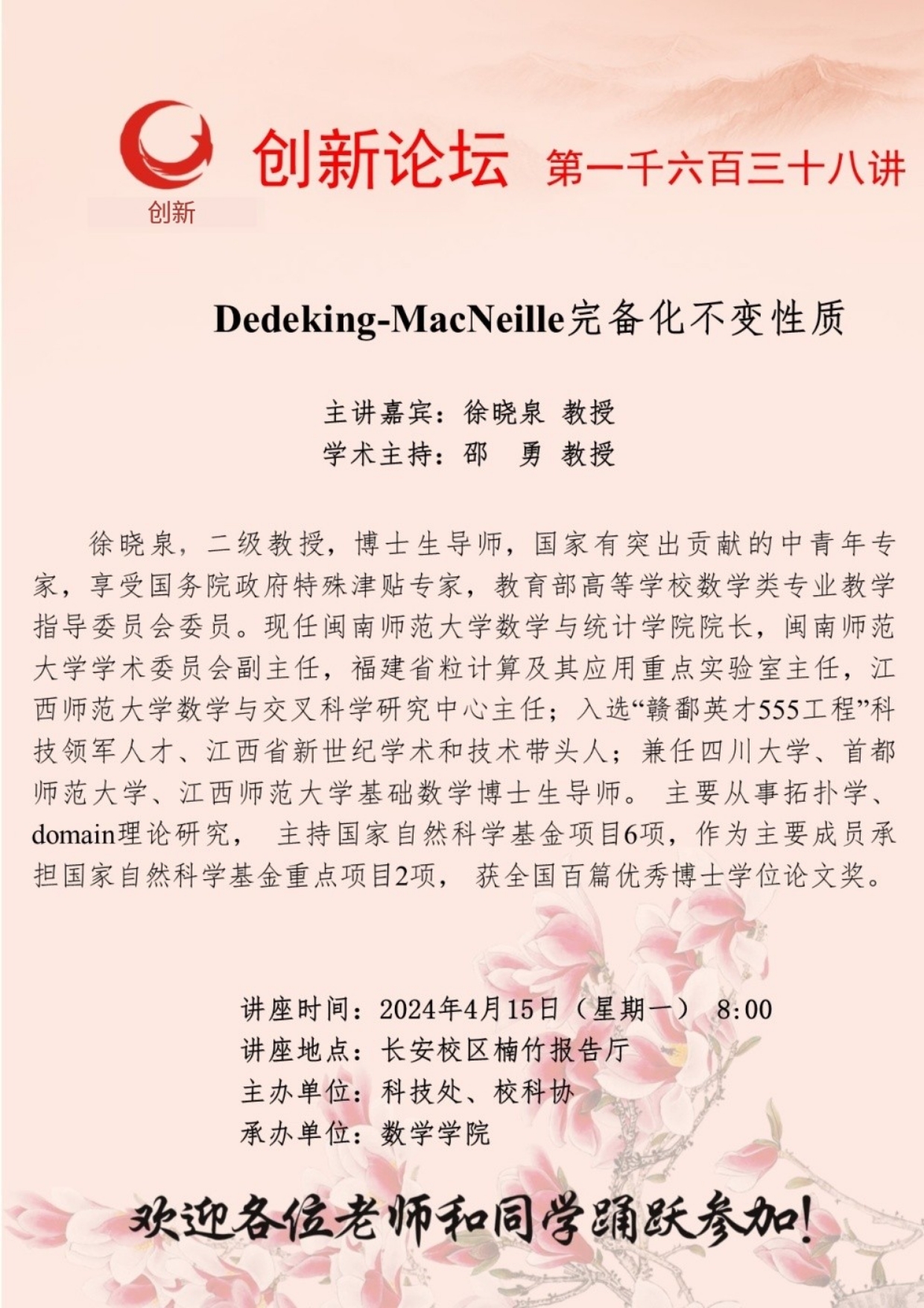 徐晓泉 教授 伟德国际1949始于英国创新论坛第一千六百三十八讲:Dedeking-MacNeille完备化不变性质 讲座时间 2024年4月15日(星期一) 8:00 讲座地点 长安校区楠竹报告厅 讲座人介绍 徐晓泉 教授 讲座内容