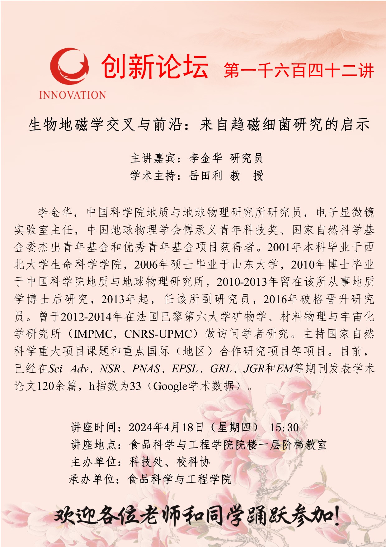 李金华 研究员 伟德国际1949始于英国创新论坛第一千六百四十二讲:生物地磁学交叉与前沿:来自趋磁细菌研究的启示 讲座时间 2024年4月18日(星期四) 15:30 讲座地点 食品科学与工程学院院楼一层阶梯教室 讲座人介绍 李金华 研究员 讲座内容