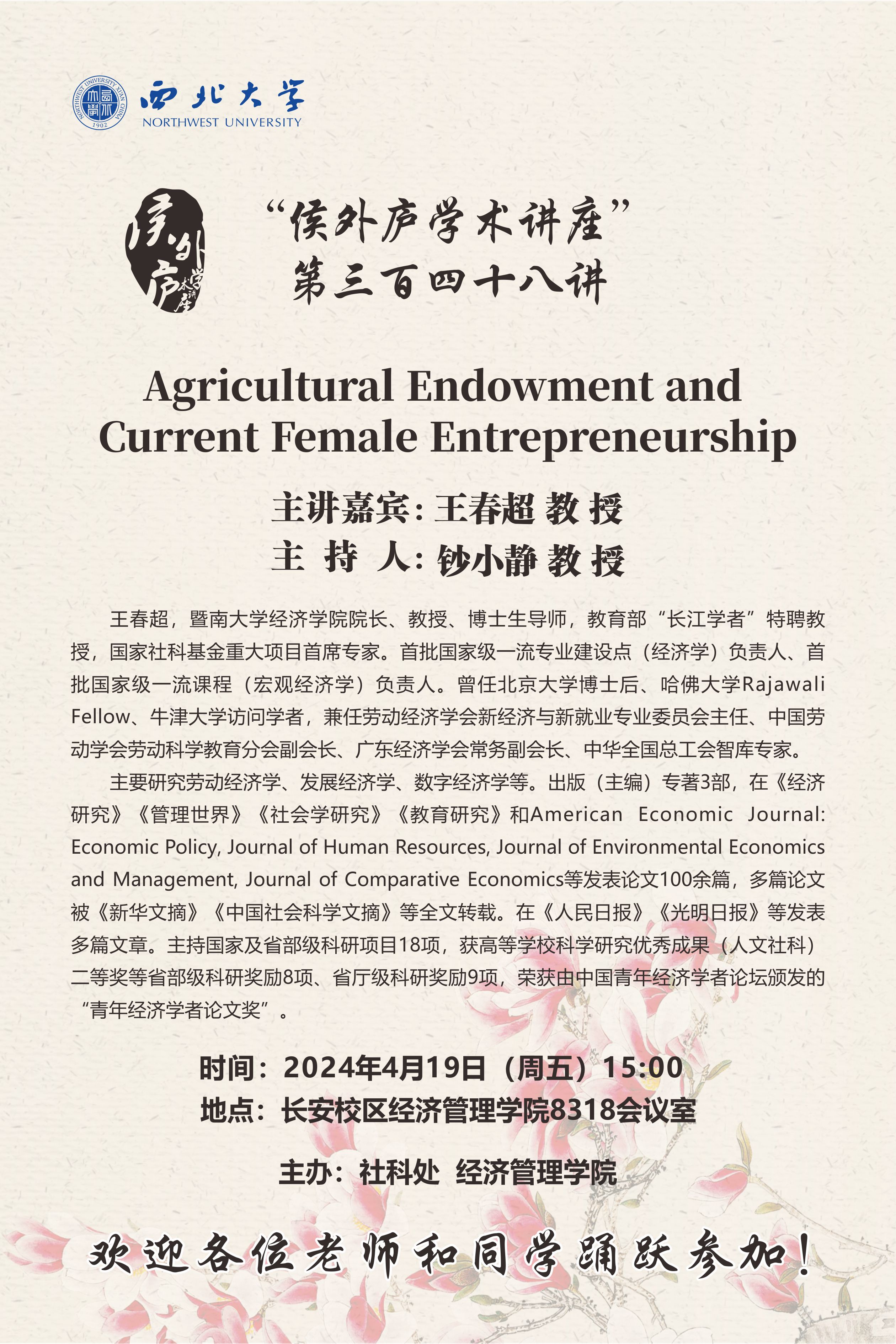 王春超 教授 侯外庐学术讲座第三百四十八讲:Agricultural Endowment and Current Female Entrepreneurship 讲座时间 2024年4月19日(周五)15:00 讲座地点 经管院8318会议室 讲座人介绍 王春超 教授 讲座内容