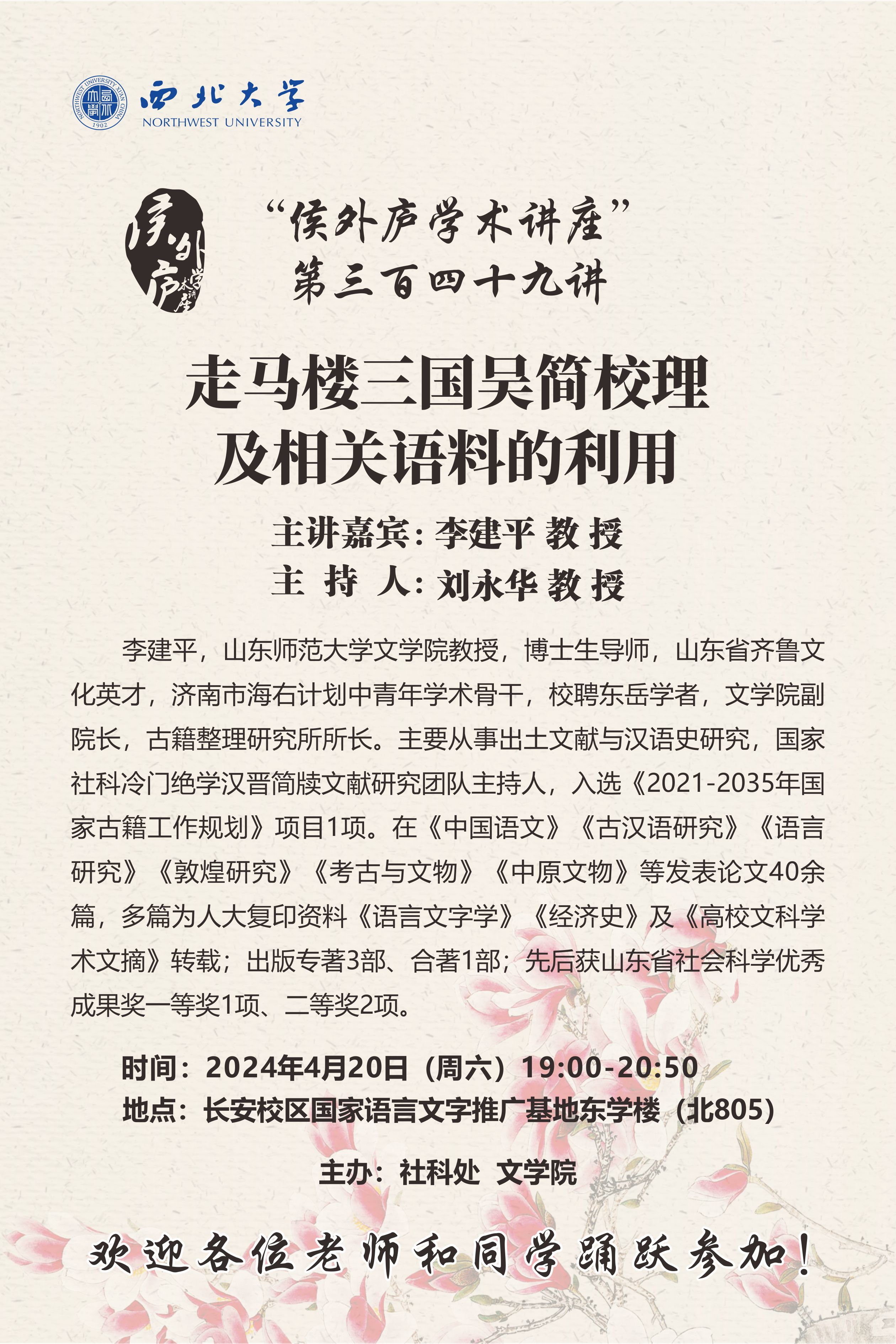 李建平 教授 侯外庐学术讲座第三百四十九讲:走马楼三国吴简校理及相关语料的利用 讲座时间 2024年4月20日(周六)19:00 讲座地点 国家语言文字推广基地(东学楼北805) 讲座人介绍 李建平 教授 讲座内容