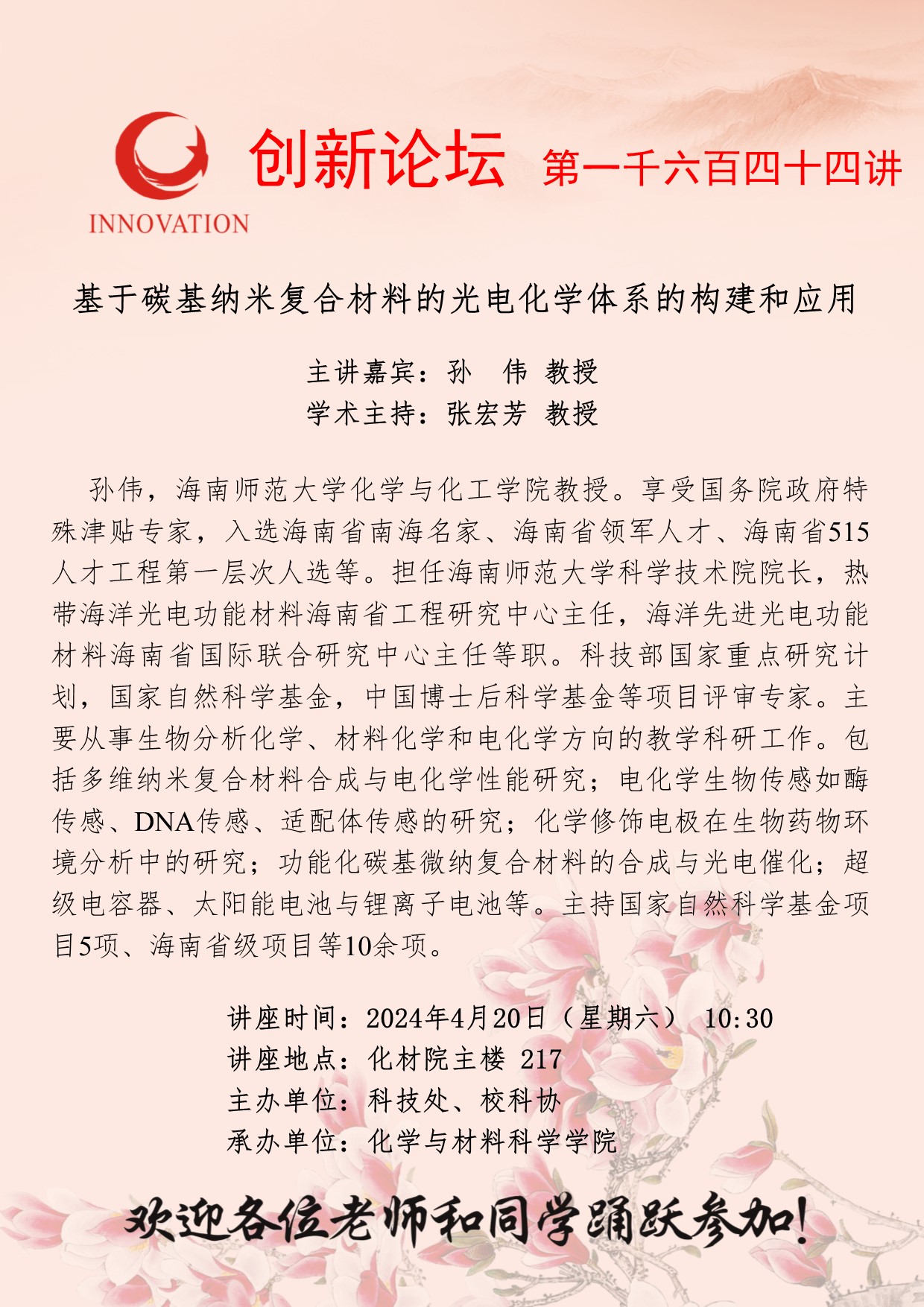 孙伟 教授 伟德国际1949始于英国创新论坛第一千六百四十四讲:基于碳基纳米复合材料的光电化学体系的构建和应用 讲座时间 2024年4月20日(星期六) 10:30 讲座地点 化材院主楼 217 讲座人介绍 孙伟 教授 讲座内容