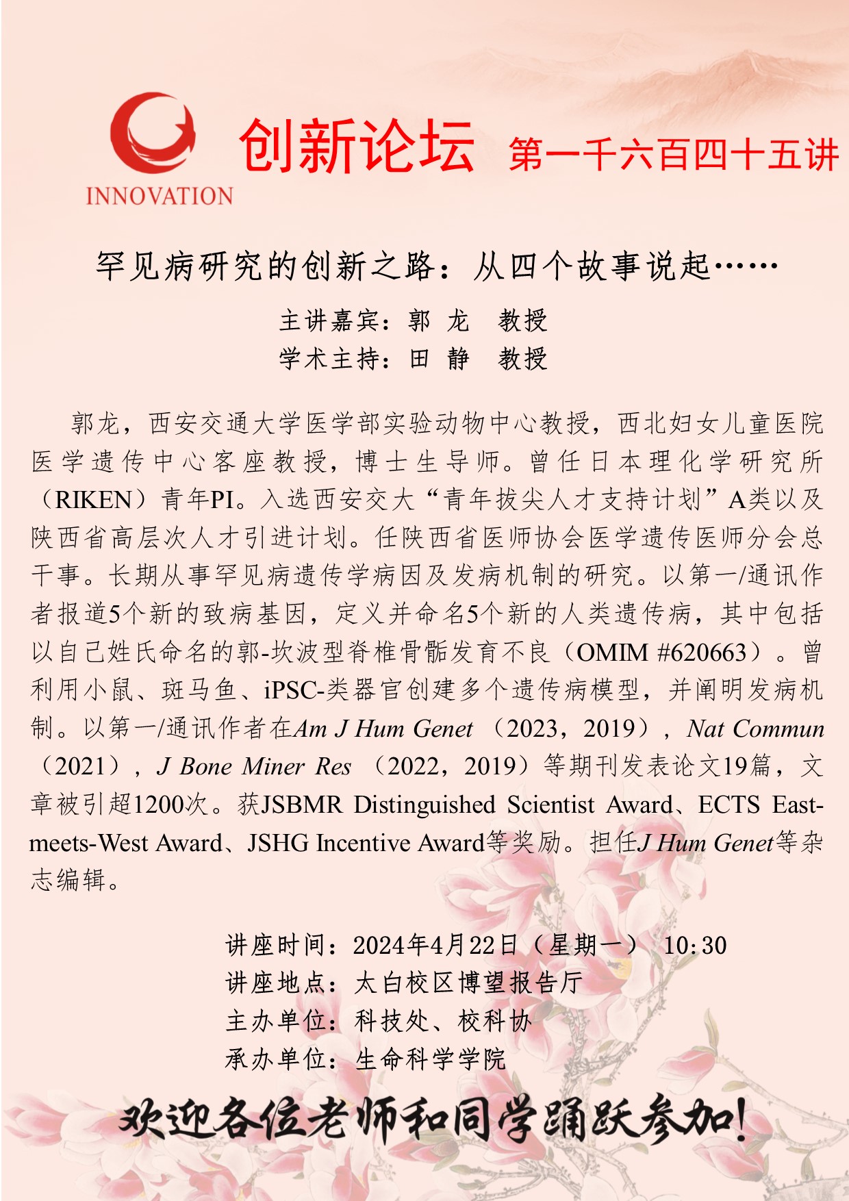 郭龙 教授 伟德国际1949始于英国创新论坛第一千六百四十五讲:罕见病研究的创新之路:从四个故事说起…… 讲座时间 2024年4月22日(星期一) 10:30 讲座地点 太白校区博望报告厅 讲座人介绍 郭龙 教授 讲座内容