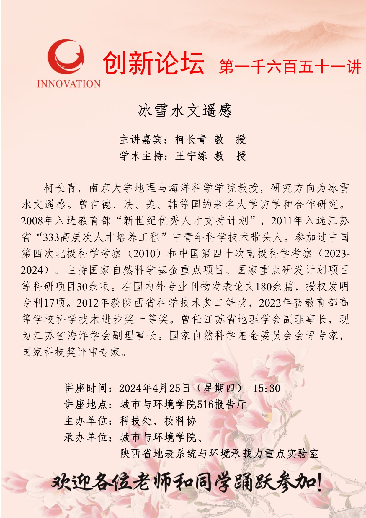 柯长青 教 授 伟德国际1949始于英国创新论坛第一千六百五十一讲:冰雪水文遥感 讲座时间 2024年4月25日(星期四) 15:30 讲座地点 城市与环境学院516报告厅 讲座人介绍 柯长青 教 授 讲座内容