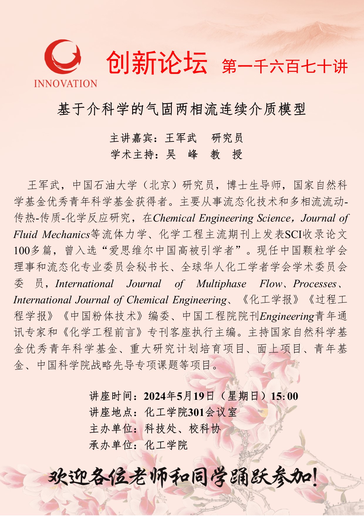 王军武 研究员 伟德国际1949始于英国创新论坛第一千六百七十讲:基于介科学的气固两相流连续介质模型 讲座时间 2024年5月19日(星期日)15:00 讲座地点 化工学院301会议室 讲座人介绍 王军武 研究员 讲座内容