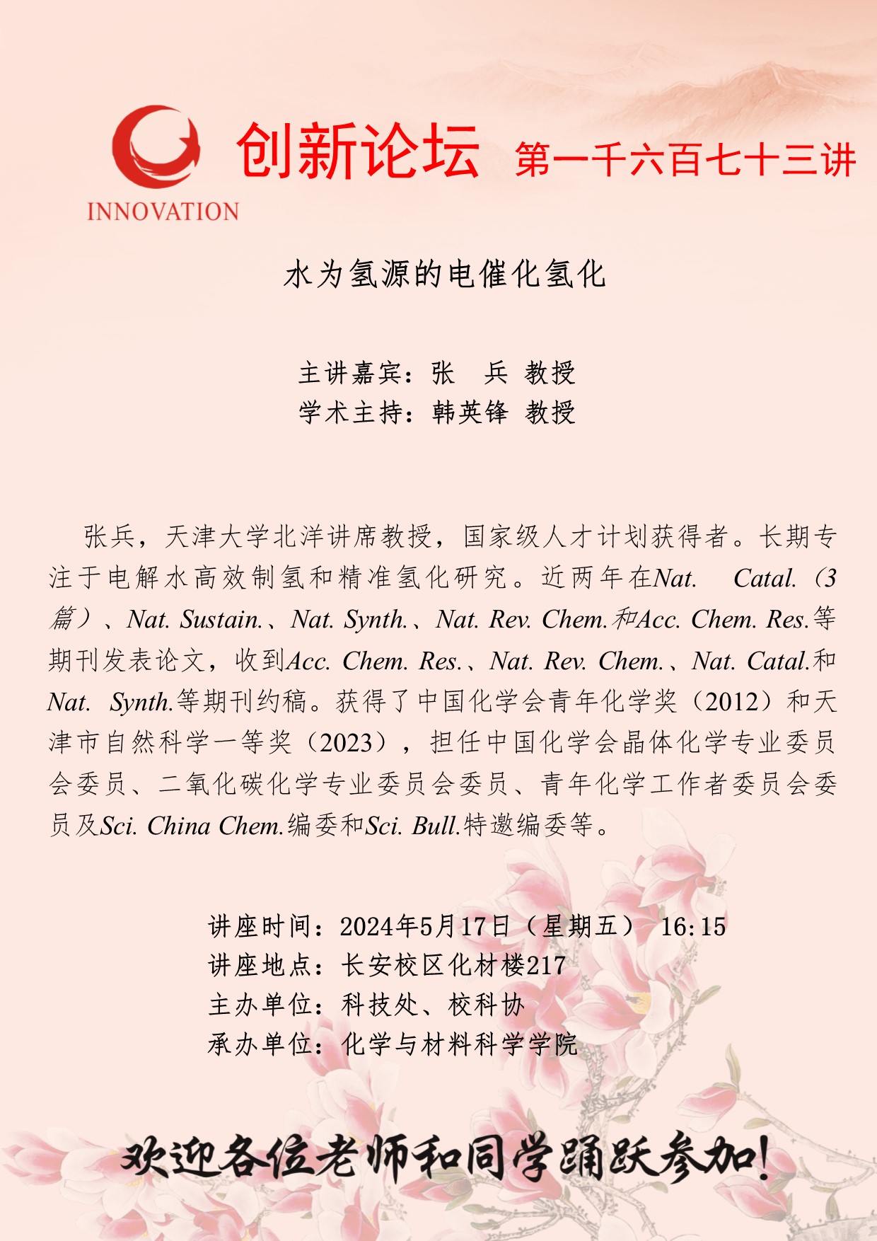张兵 教授 伟德国际1949始于英国创新论坛第一千六百七十三讲:水为氢源的电催化氢化 讲座时间 2024年5月17日(星期五) 16:15 讲座地点 长安校区化材楼217 讲座人介绍 张兵 教授 讲座内容