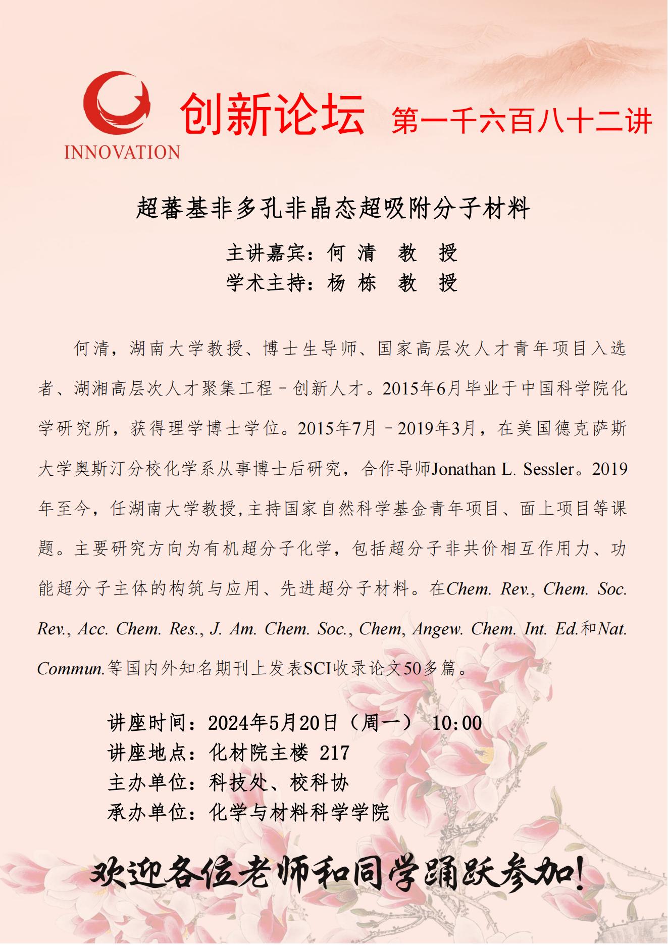 何清 教授 伟德国际1949始于英国创新论坛第一千六百八十二讲:超蕃基非多孔非晶态超吸附分子材料 讲座时间 2024年5月20日(星期一) 10:00 讲座地点 长安校区化材院主楼 217 讲座人介绍 何清 教授 讲座内容