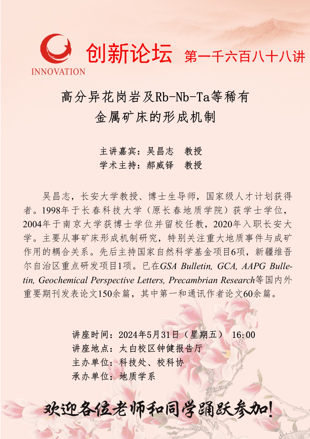 吴昌志 教授 伟德国际1949始于英国创新论坛第一千六百八十八讲:高分异花岗岩及Rb-Nb-Ta等稀有金属矿床的形成机制 讲座时间 2024年5月31日(星期五) 16:00 讲座地点 太白校区钟健报告厅 讲座人介绍 吴昌志 教授 讲座内容