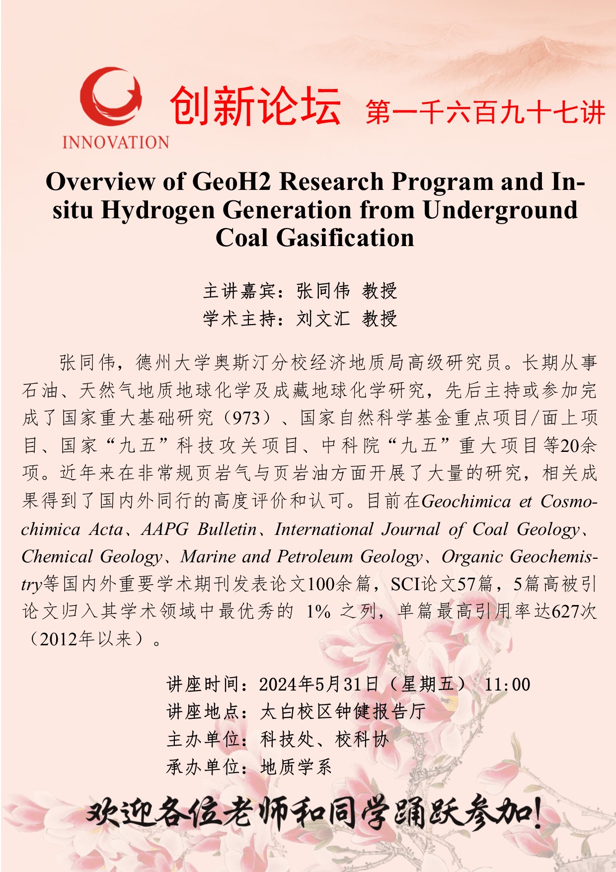 张同伟 教授 伟德国际1949始于英国创新论坛第一千六百九十七讲:Overview of GeoH2 Research Program and In-situ Hydrogen Generation from Underground Coal Gasification 讲座时间 2024年5月31日(星期五) 11:00 讲座地点 太白校区钟健报告厅 讲座人介绍 张同伟 教授 讲座内容