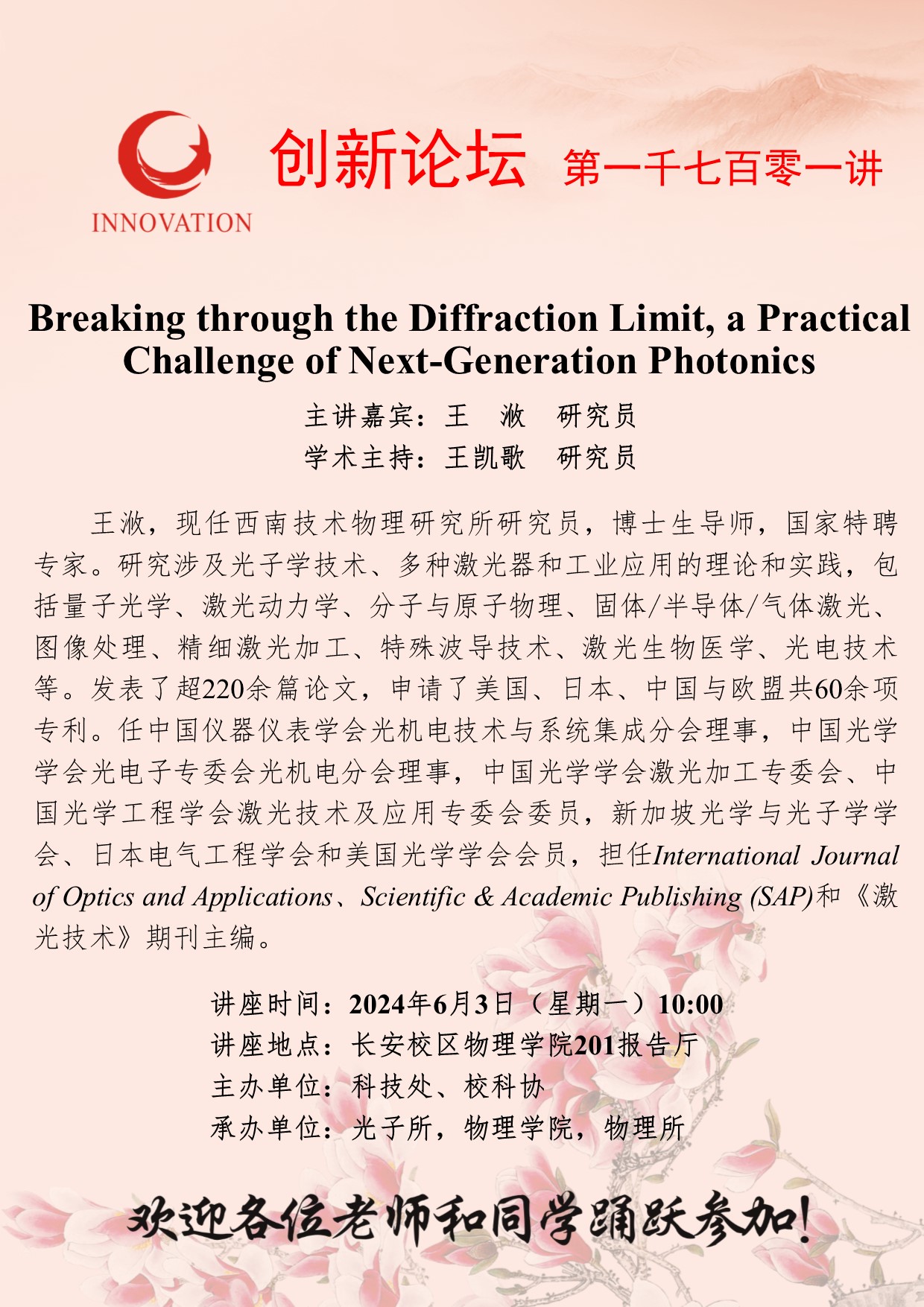 王浟 研究员 伟德国际1949始于英国创新论坛第一千七百零一讲:Breaking through the Diffraction Limit, a Practical Challenge of Next-Generation Photonics 讲座时间 2024年6月3日(星期一)10:00 讲座地点 长安校区物理学院201报告厅 讲座人介绍 王浟 研究员 讲座内容