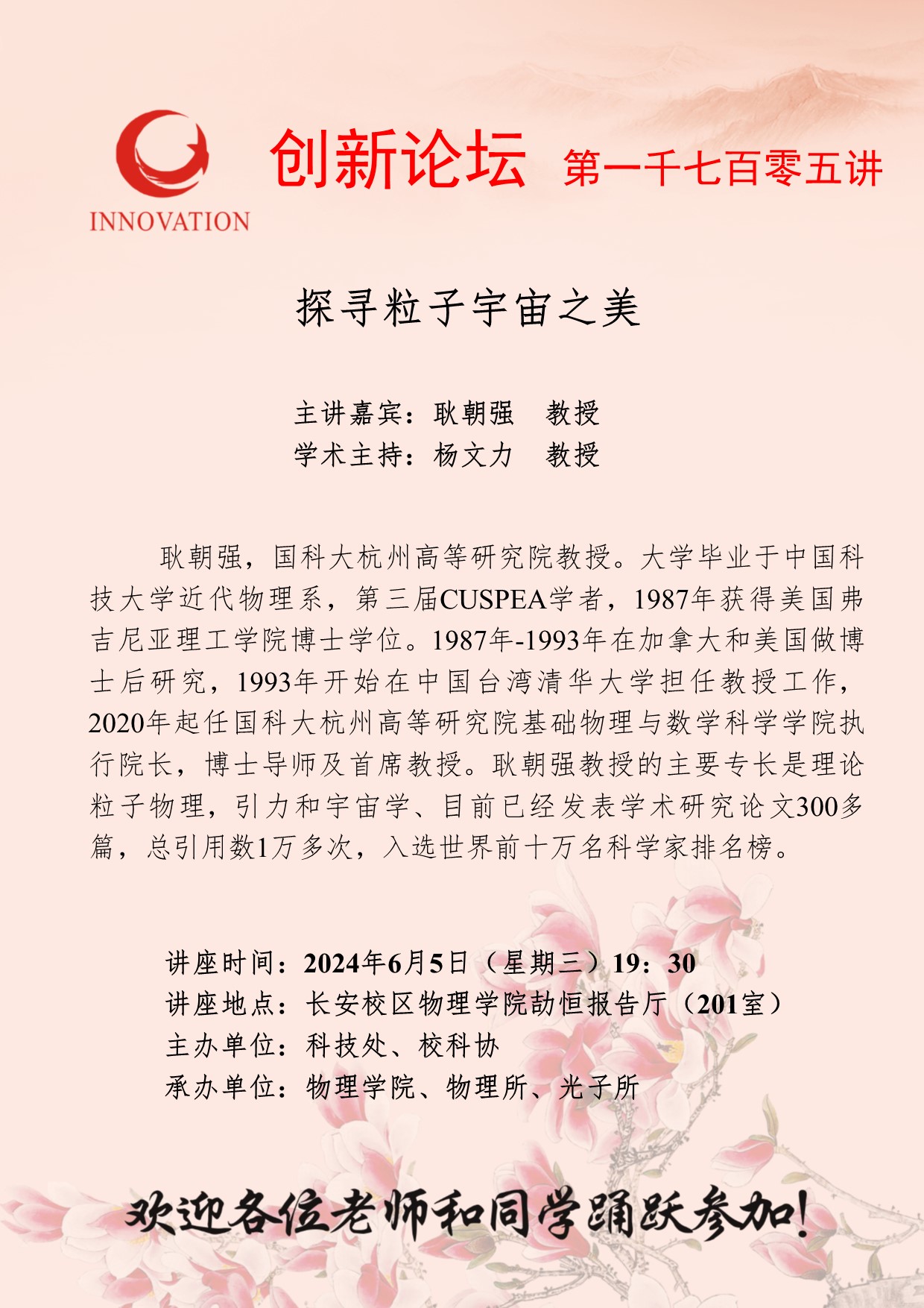耿朝强 教授 伟德国际1949始于英国创新论坛第一千七百零五讲:探寻粒子宇宙之美 讲座时间 2024年6月5日(星期三)19:30 讲座地点 长安校区物理学院劼恒报告厅(201室) 讲座人介绍 耿朝强 教授 讲座内容