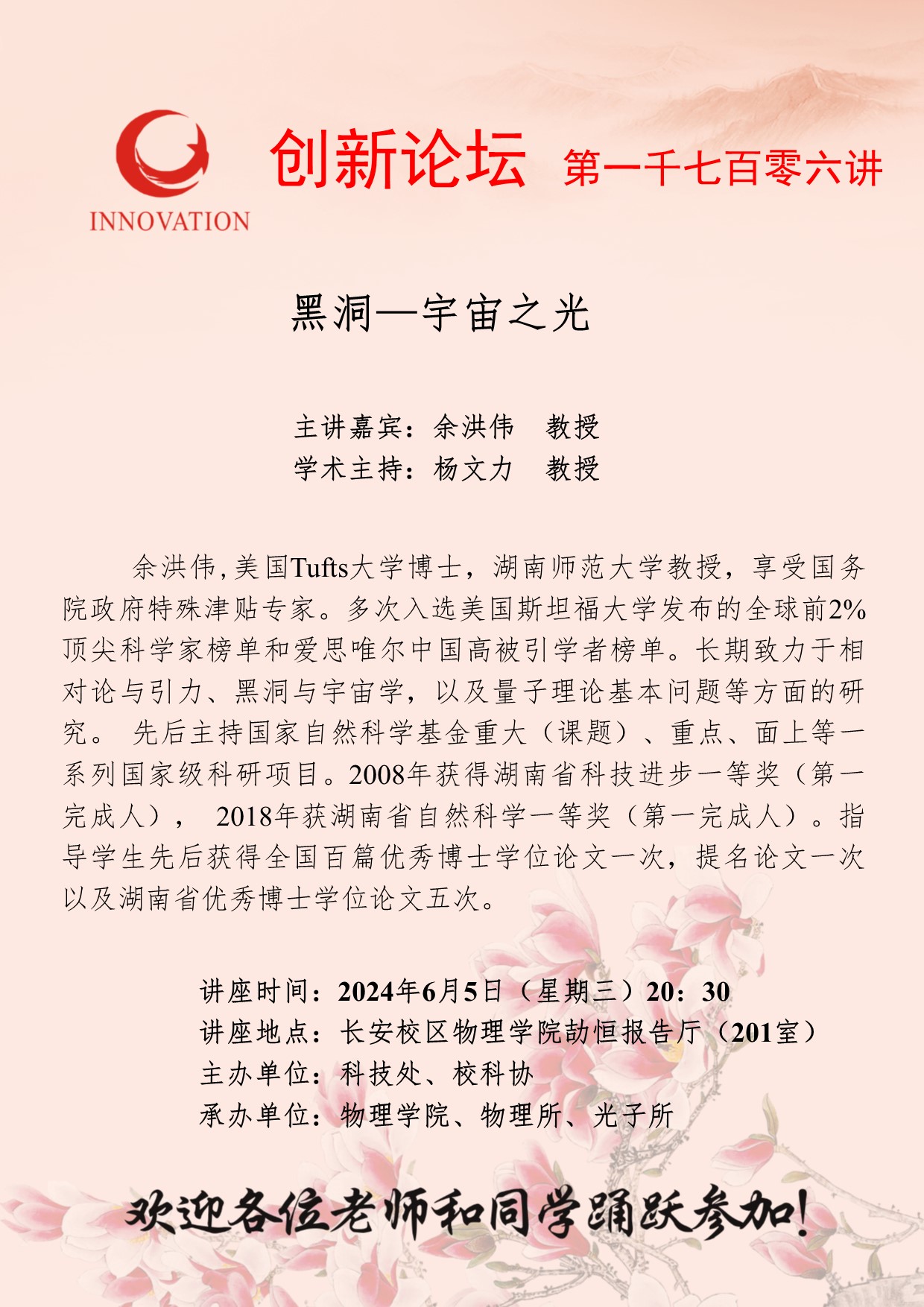 余洪伟 教授 伟德国际1949始于英国创新论坛第一千七百零六讲:黑洞—宇宙之光 讲座时间 2024年6月5日(星期三)20:30 讲座地点 长安校区物理学院劼恒报告厅(201室) 讲座人介绍 余洪伟 教授 讲座内容