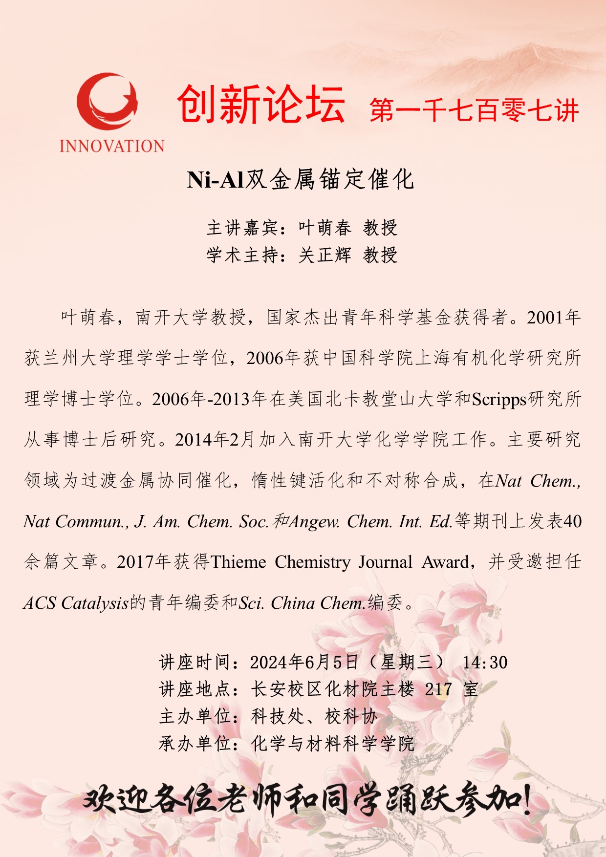 叶萌春 教授 伟德国际1949始于英国创新论坛第一千七百零七讲:Ni-Al双金属锚定催化 讲座时间 2024年6月5日(星期三) 14:30 讲座地点 长安校区化材院主楼 217 室 讲座人介绍 叶萌春 教授 讲座内容