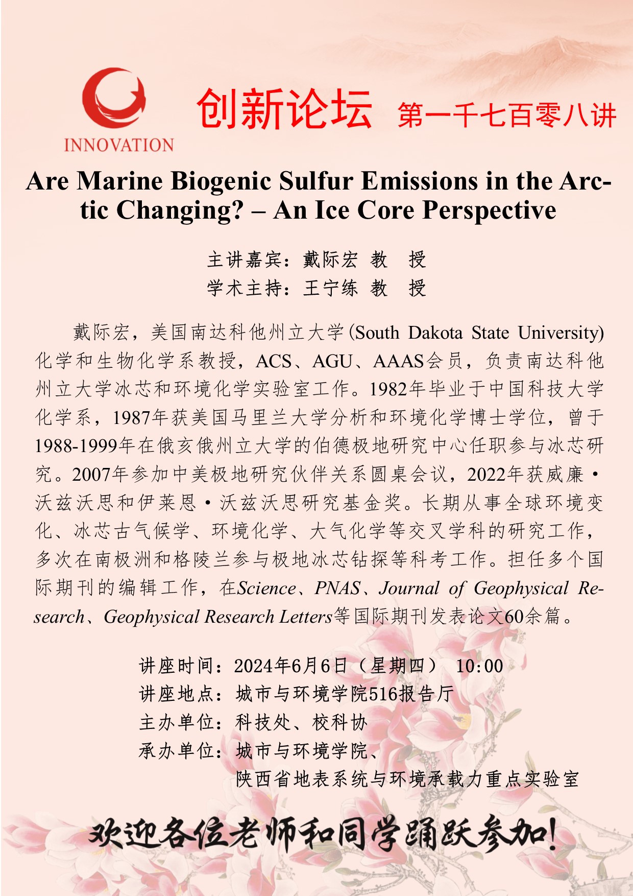 戴际宏 教授 伟德国际1949始于英国创新论坛第一千七百零八讲:Are Marine Biogenic Sulfur Emissions in the Arctic Changing? – An Ice Core Perspective 讲座时间 2024年6月6日(星期四) 10:00 讲座地点 城市与环境学院516报告厅 讲座人介绍 戴际宏 教授 讲座内容