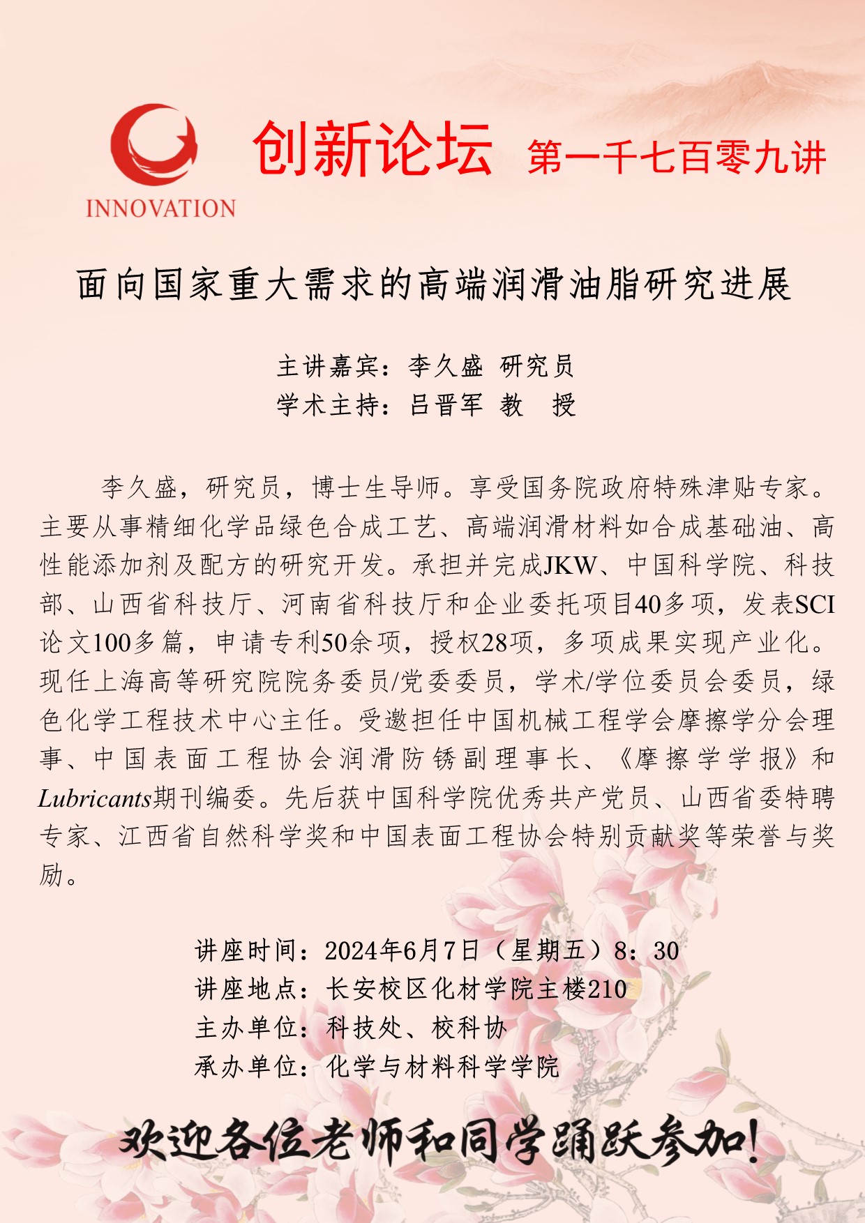 李久盛 研究员 伟德国际1949始于英国创新论坛第一千七百零九讲:面向国家重大需求的高端润滑油脂研究进展 讲座时间 2024年6月7日(星期五)8:30 讲座地点 长安校区化材学院主楼210 讲座人介绍 李久盛 研究员 讲座内容