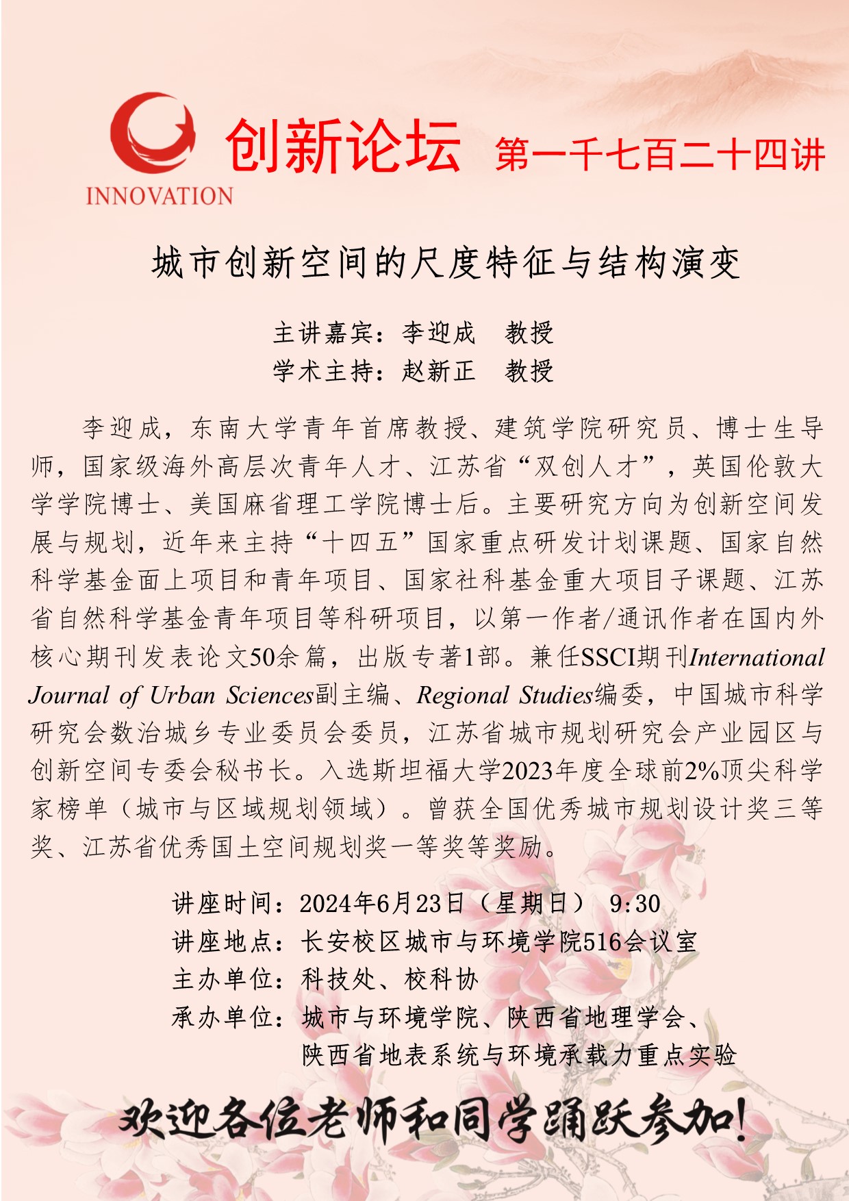 李迎成 教授 伟德国际1949始于英国创新论坛第一千七百二十四讲:城市创新空间的尺度特征与结构演变 讲座时间 2024年6月23日(星期日) 9:30 讲座地点 长安校区城市与环境学院516会议室 讲座人介绍 李迎成 教授 讲座内容