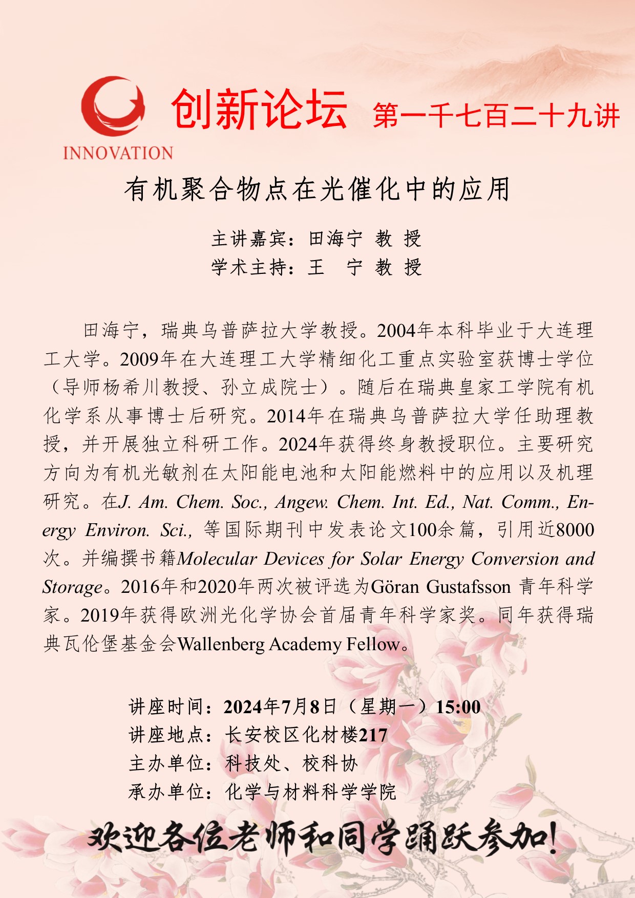 田海宁 教授 伟德国际1949始于英国创新论坛第一千七百二十九讲:有机聚合物点在光催化中的应用 讲座时间 2024年7月8日(星期一)15:00 讲座地点 长安校区化材楼217 讲座人介绍 田海宁 教授 讲座内容