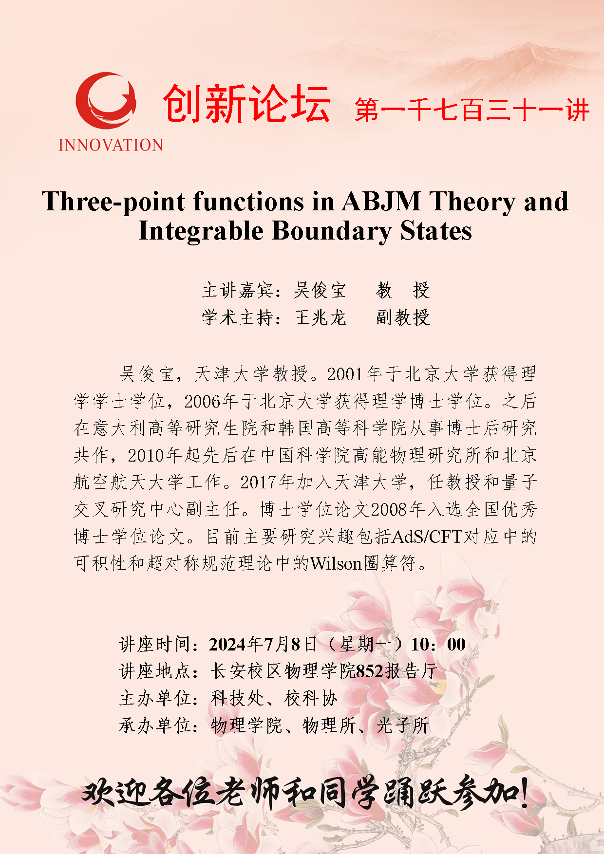 吴俊宝 教授 伟德国际1949始于英国创新论坛第一千七百三十一讲:Three-point functions in ABJM Theory and Integrable Boundary States 讲座时间 2024年7月8日(星期一)10:00 讲座地点 长安校区物理学院852报告厅 讲座人介绍 吴俊宝 教授 讲座内容