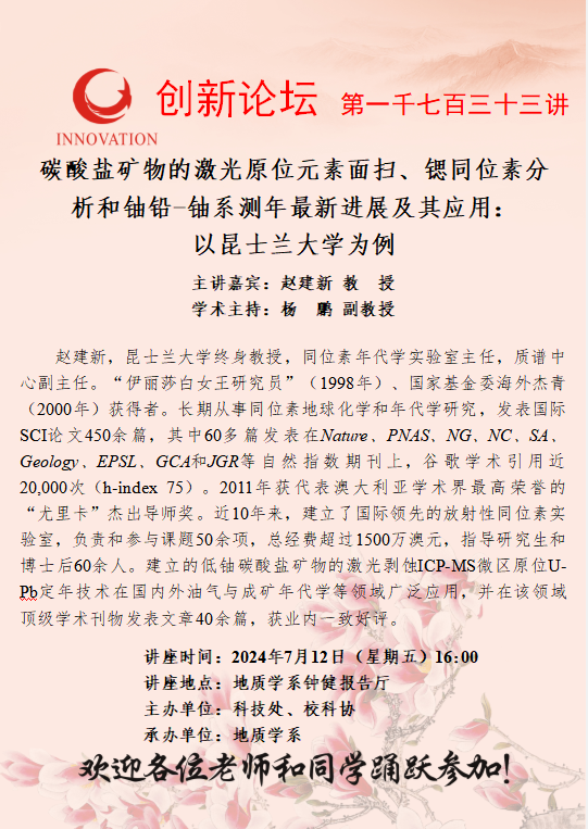 赵建新 教授 伟德国际1949始于英国创新论坛第一千七百三十三讲:碳酸盐矿物的激光原位元素面扫、锶同位素分析和铀铅-铀系测年最新进展及其应用:以昆士兰大学为例 讲座时间 2024年7月12日(星期五)16:00 讲座地点 地质学系钟健报告厅 讲座人介绍 赵建新 教授 讲座内容