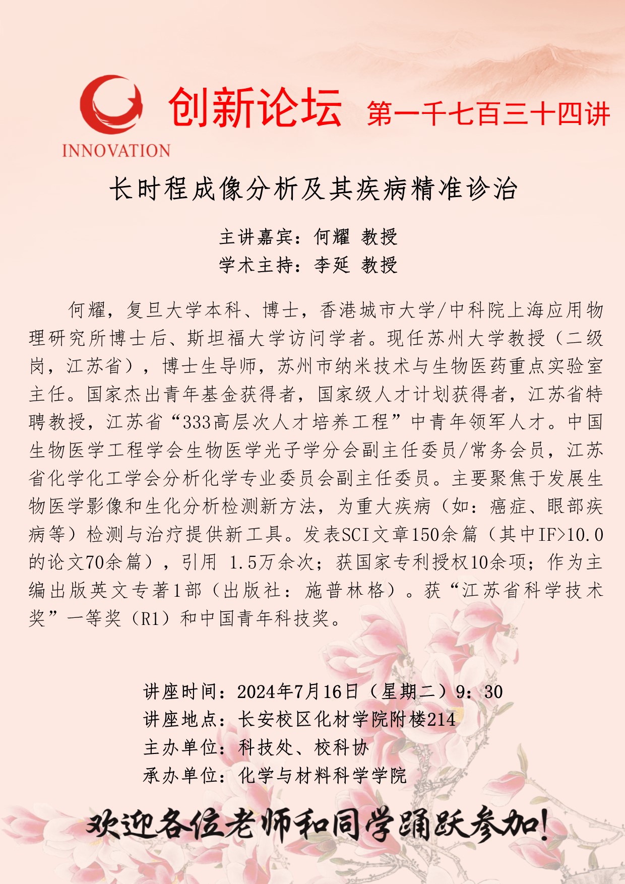何耀 教授 伟德国际1949始于英国创新论坛第一千七百三十四讲:长时程成像分析及其疾病精准诊治 讲座时间 2024年7月16日(星期二)9:30 讲座地点 长安校区化材学院附楼214 讲座人介绍 何耀 教授 讲座内容