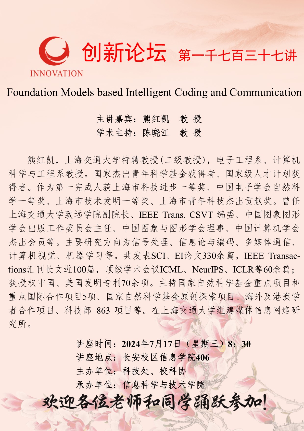 熊红凯 教授 伟德国际1949始于英国创新论坛第一千七百三十七讲:Foundation Models based Intelligent Coding and Communication 讲座时间 2024年7月17日(星期三)8:30 讲座地点 长安校区信息学院406 讲座人介绍 熊红凯 教授 讲座内容