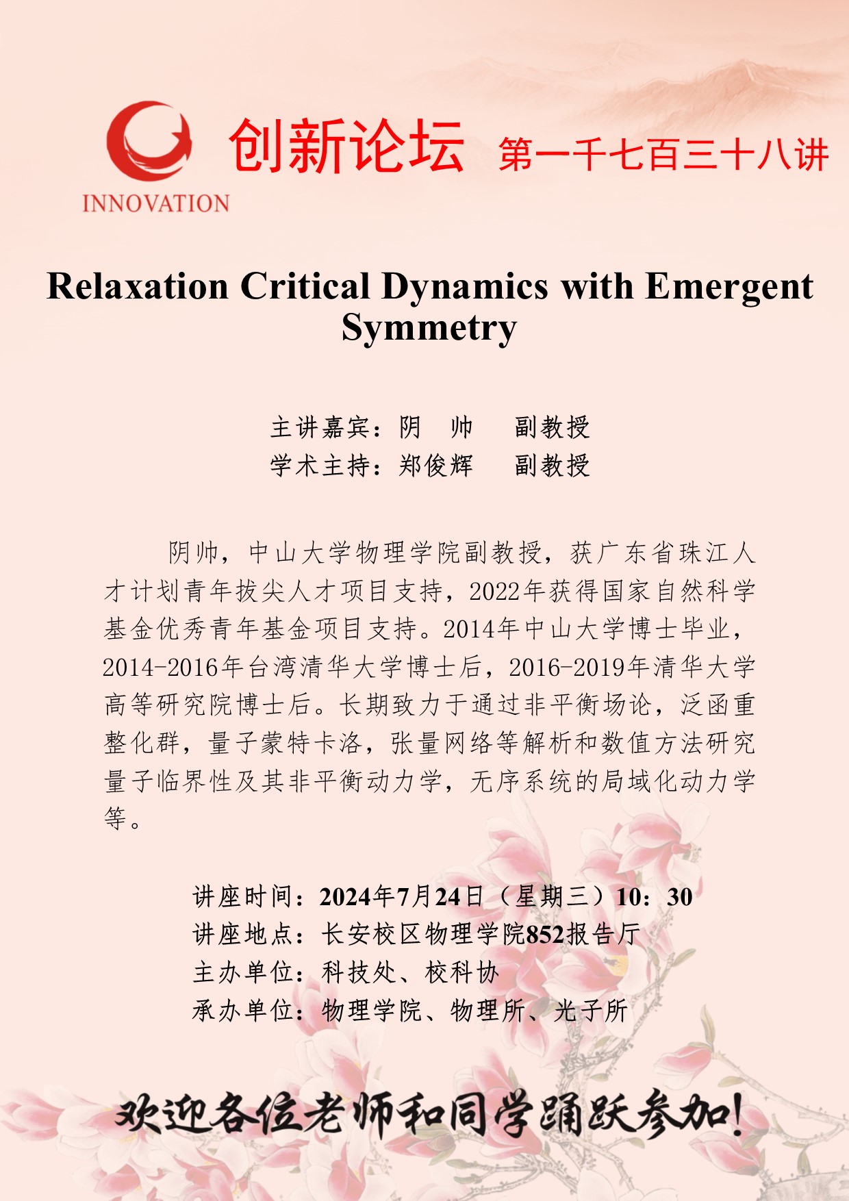 阴帅 副教授 伟德国际1949始于英国创新论坛第一千七百三十八讲:Relaxation Critical Dynamics with Emergent Symmetry 讲座时间 2024年7月24日(星期三)10:30 讲座地点 长安校区物理学院852报告厅 讲座人介绍 阴帅 副教授 讲座内容