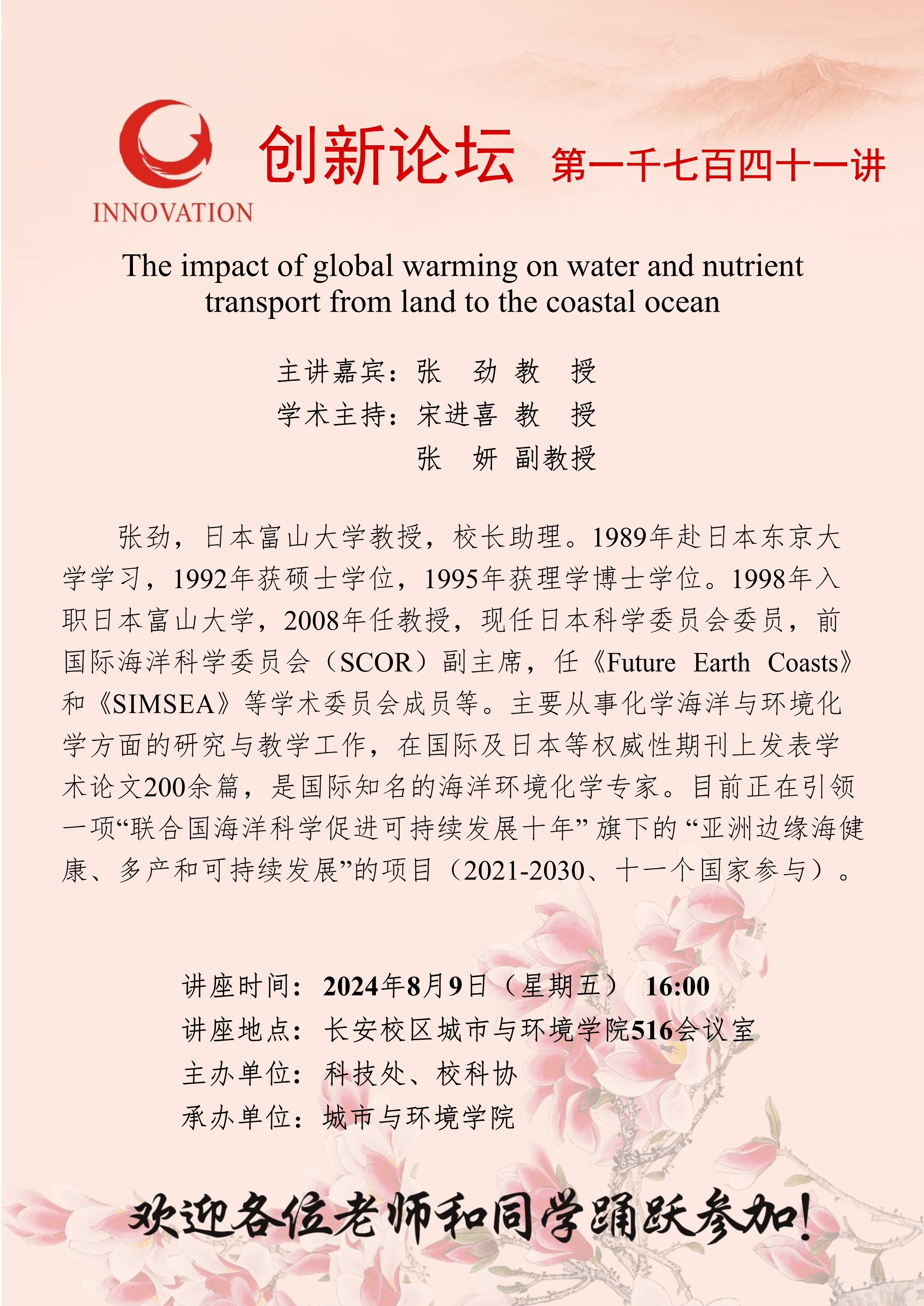 张劲 教授 伟德国际1949始于英国创新论坛第一千七百四十一讲:The impact of global warming on water and nutrient transport from land to the coastal ocean 讲座时间 2024年8月9日(星期五)16:00 讲座地点 长安校区城市与环境学院516会议室 讲座人介绍 张劲 教授 讲座内容