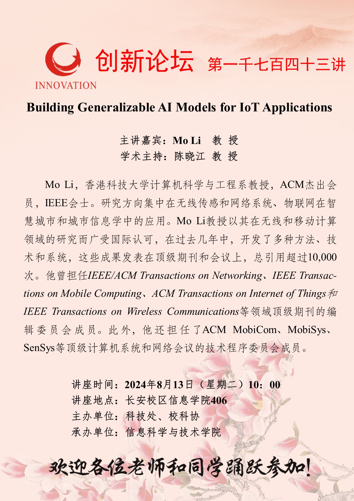 Mo Li 教授 伟德国际1949始于英国创新论坛第一千七百四十三讲:Building Generalizable AI Models for IoT Applications 讲座时间 2024年8月13日(星期二)10:00 讲座地点 长安校区信息学院406 讲座人介绍 Mo Li 教授 讲座内容